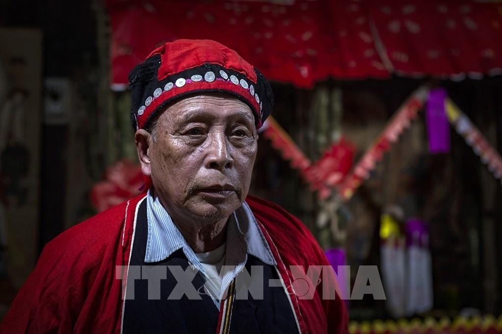 Ông Lý Văn Hềnh, thầy cúng ở Bản Sưng, xã Cao Sơn (Đà Bắc, Hòa Bình) đã được cấp thượng giới 12 ngọn đèn là một trong 12 thầy làm lễ đám chay của dòng họ Triệu. Ảnh: Trọng Đạt - TTXVN