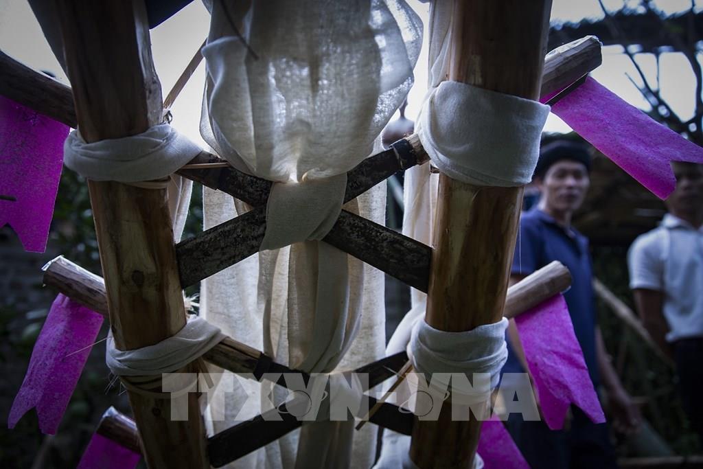 Chiếc thang đặc biệt để lên đàn tế được làm bằng các lưỡi dao quắm đặt chéo nhau. Tổng cộng có 13 lưỡi dao, lưỡi trên cùng đặt ngang, 12 lưỡi còn lại bắt chéo, phần mũi cắm vào thân gỗ cầu thang, phần cán dao buộc lại bằng vải trắng. Ảnh: Trọng Đạt - TTXVN