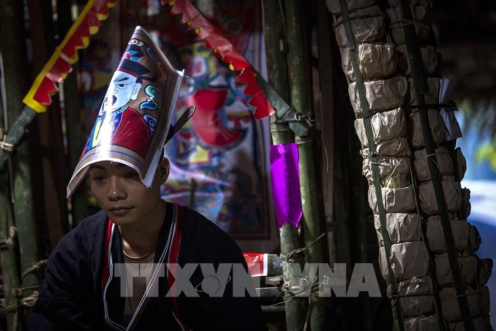 Một thầy cúng trẻ được cấp hạ giới 3 ngọn đèn tham gia lễ đám chay của dòng họ Triệu ở bản Sưng (Đà Bắc, Hòa Bình). Ảnh: Trọng Đạt - TTXVN