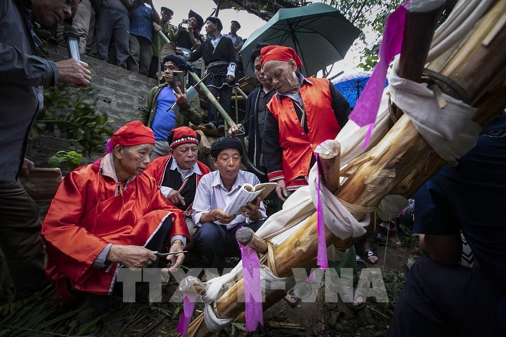 Các thầy cúng và người trưởng họ cao tuổi nhất dòng họ làm lễ trên đàn tế. Ảnh: Trọng Đạt - TTXVN