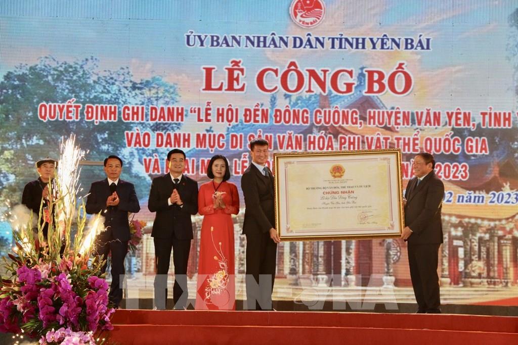 Uỷ viên Trung ương Đảng, Bộ trưởng Bộ Văn hoá, Thể thao và Du lịch Nguyễn Văn Hùng (bên phải) trao chứng nhận “Lễ hội Đền Đông Cuông, huyện Văn Yên, tỉnh Yên Bái” là Di sản văn hóa phi vật thể quốc gia cho đại diện tỉnh Yên Bái. Ảnh: Tuấn Anh - TTXVN