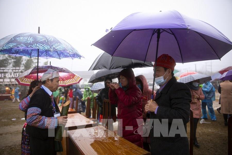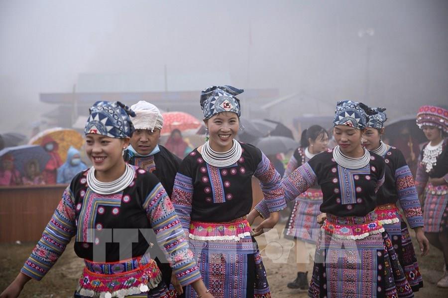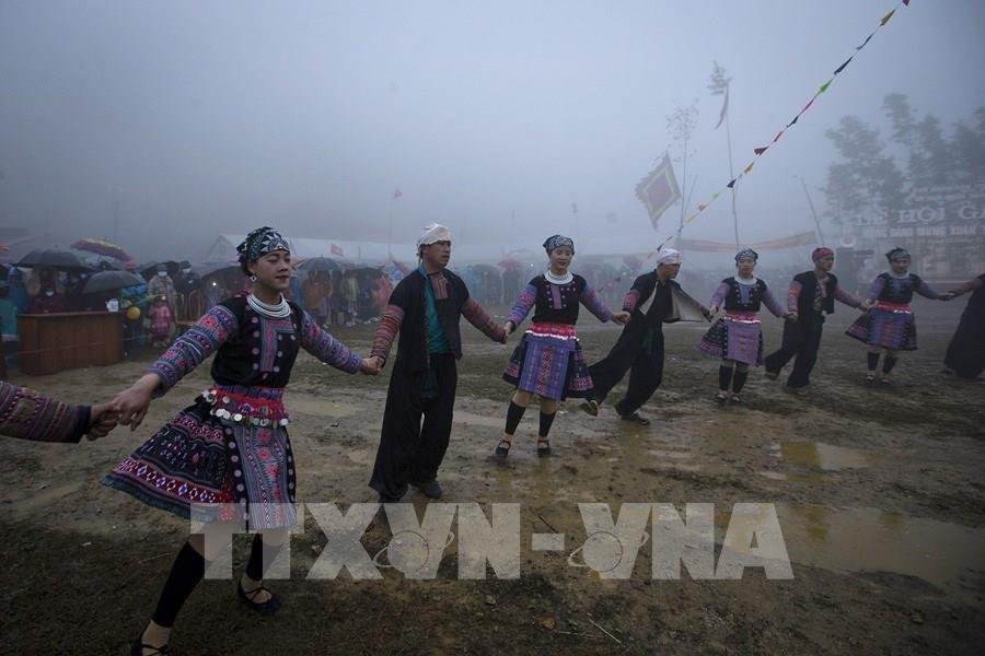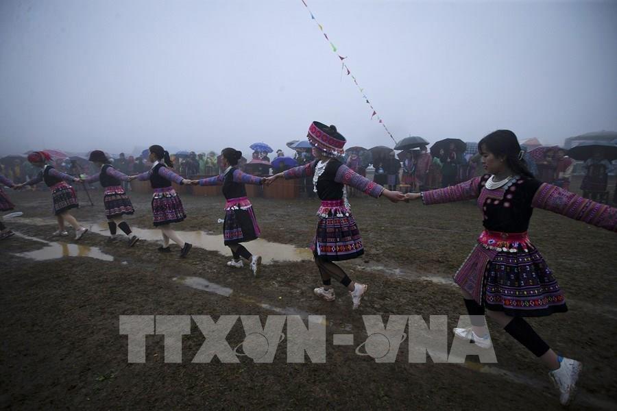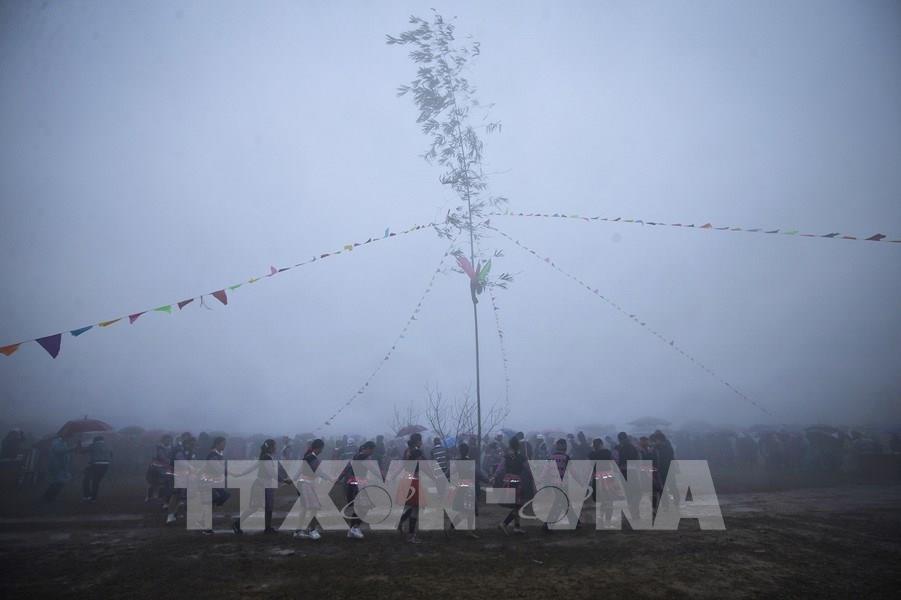 Các chàng trai, cô gái Mông cùng du khách nắm tay nhau nhảy múa theo tiếng khèn xung quanh cây nêu mặc cho trời mưa và gió lạnh. Ảnh: Trọng Đạt-TTXVN