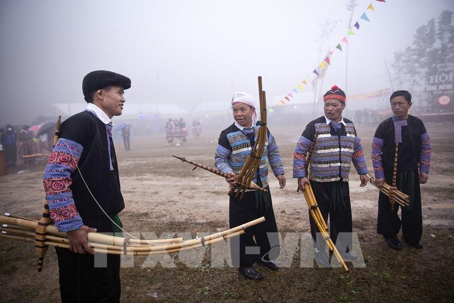 Những nhạc công người Mông thổi khèn trong lễ hội Gầu Thào. Ảnh: Trọng Đạt-TTXVN