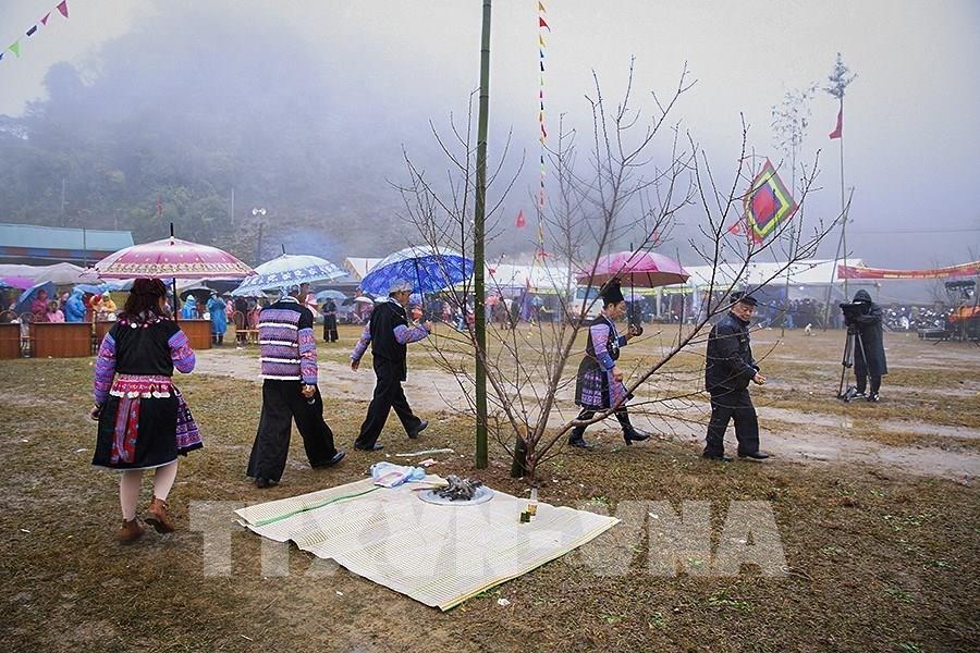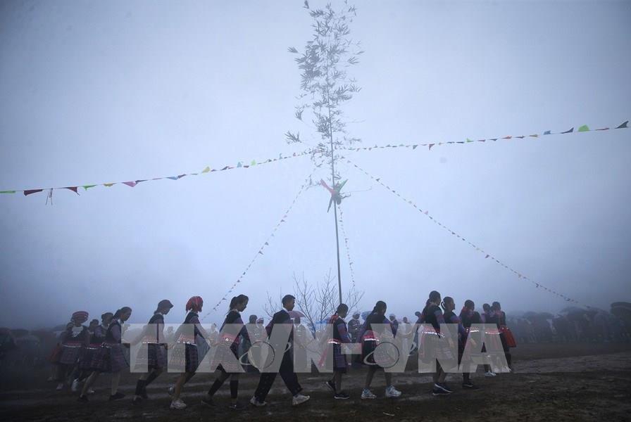 Sau khi thầy cúng thực hiện xong các nghi lễ, các chàng trai, cô gái Mông cùng du khách nắm tay nhau nhảy múa theo tiếng khèn xung quanh cây nêu. Ảnh: Trọng Đạt-TTXVN