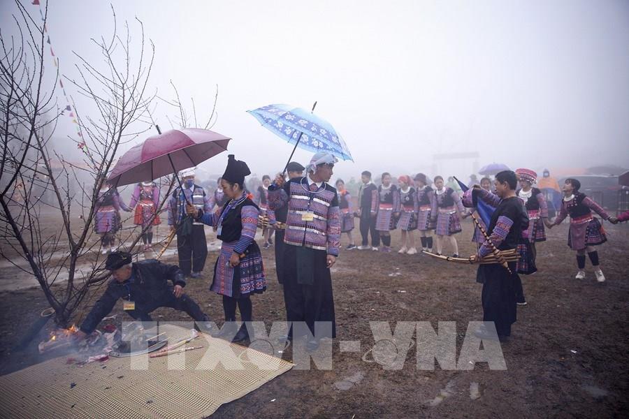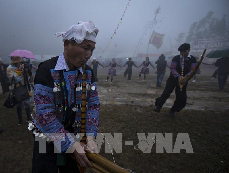 Mặc thời tiết mưa lạnh, những nhạc công hết mình tạo ra những giai điệu truyền thống trong điệu múa tập thể của đồng bào Mông. Ảnh: Trọng Đạt-TTXVN