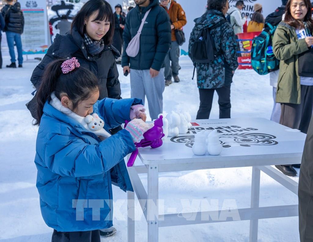 Du khách nhí trổ tài làm tượng tuyết "mini". Ảnh: Xuân Giao – PV TTXVN