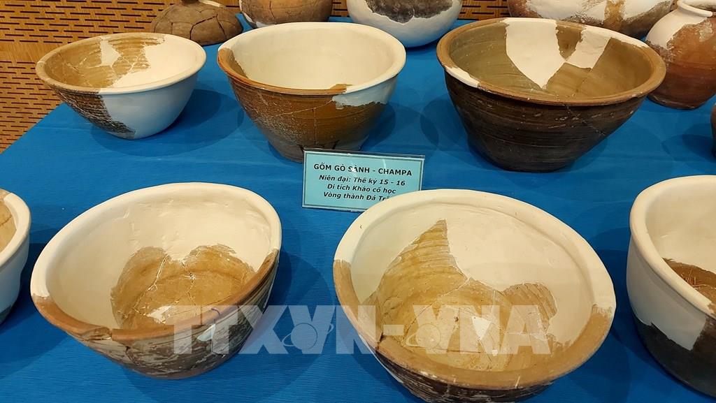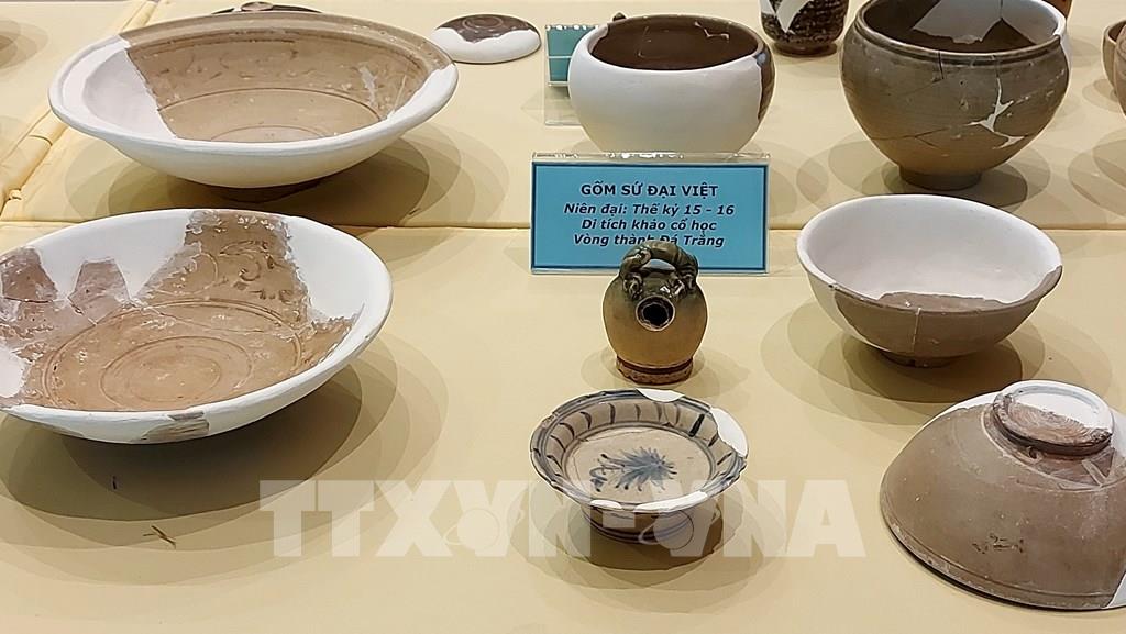 Trưng bày đồ gốm có chất liệu bán sứ được khai quật tại Vòng Thành Đá Trắng. Ảnh: Huỳnh Sơn-TTXVN