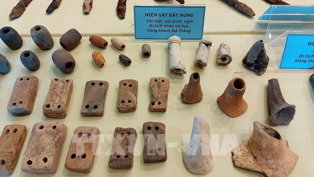 Trưng bày chì lưới, vật nhỏ làm bằng đất nung, buộc vào chài lưới đánh cá hoặc dây câu, được tìm thấy ở khu vực trung tâm của di tích Thành Đá Trắng, với số lượng khá lớn, tổng số lên đến hơn 120 hiện vật. Ảnh: Huỳnh Sơn-TTXVN