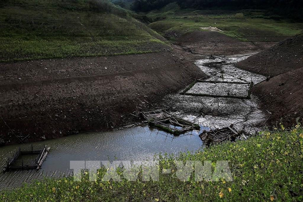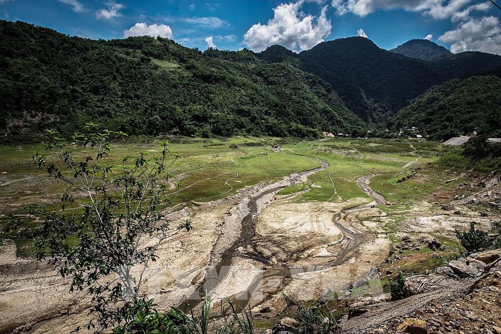 Một nhánh sông Đà chảy về xã Hiền Lương, huyện Đà Bắc nhiều tháng qua đã cạn trơ đáy. Những năm trước, tàu du lịch có thể đưa du khách qua nơi đây để ghé thăm các Homestay của xã Hiền Lương. Ảnh: Trọng Đạt - TTXVN