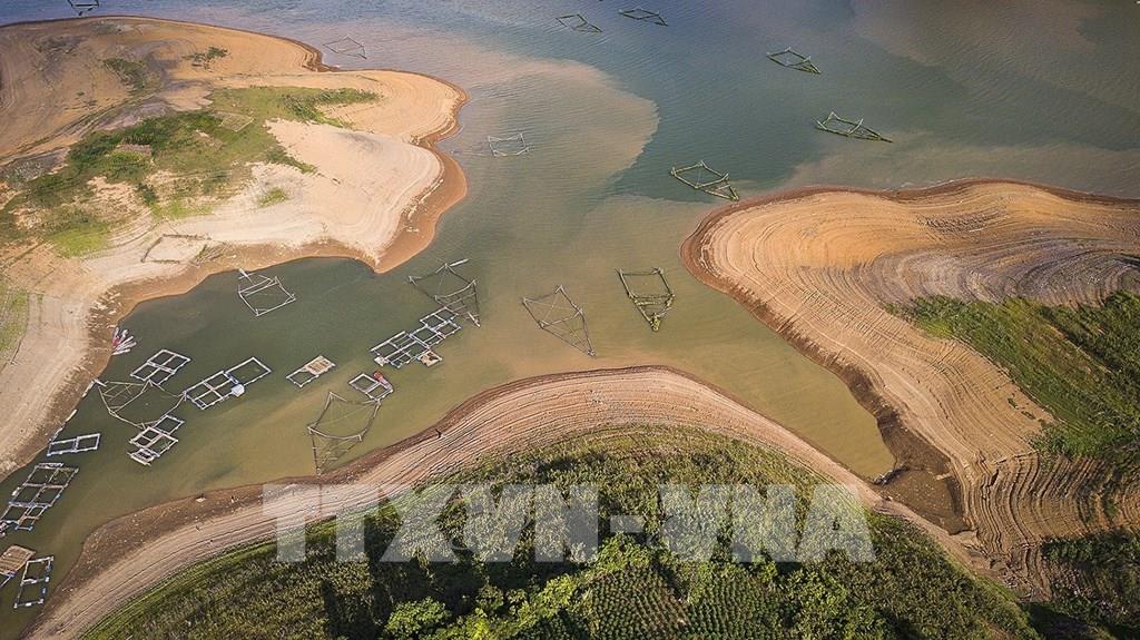 Một nhánh sông Đà bị cạn nước và những lồng cá của người dân bị mặc kẹt lại trên vùng đất cạn ở xã Tiền Phong, huyện Đà Bắc. Ảnh: Trọng Đạt - TTXVN