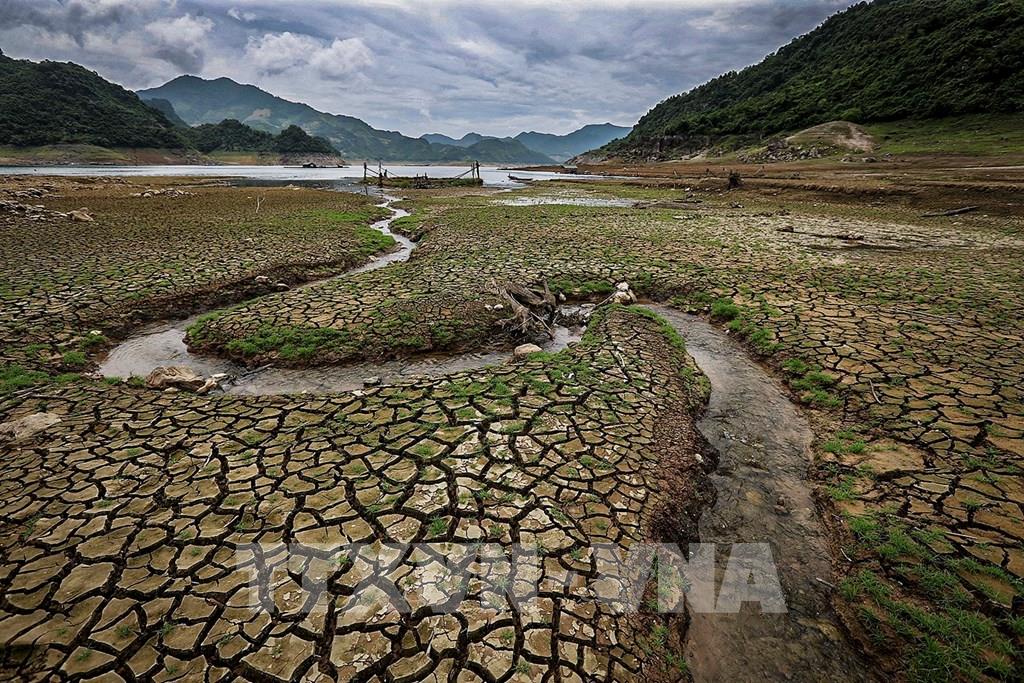 Hình ảnh khô hạn và nứt nẻ của lòng sông Đà khi thiếu nước trên nhánh sông chảy về xã Hiền Lương, huyện Đà Bắc. Ảnh: Trọng Đạt - TTXVN