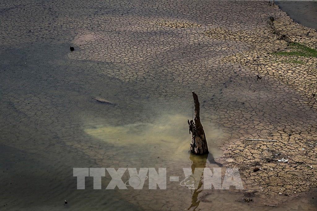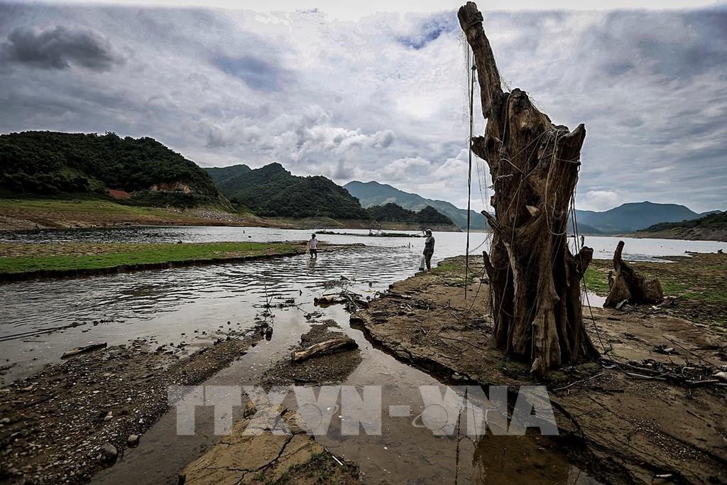 Một gốc cây chết khô nằm ngay dưới lòng hồ nứt nẻ thuộc địa phận xã Hiền Lương, huyện Đà Bắc. Ảnh: Trọng Đạt - TTXVN