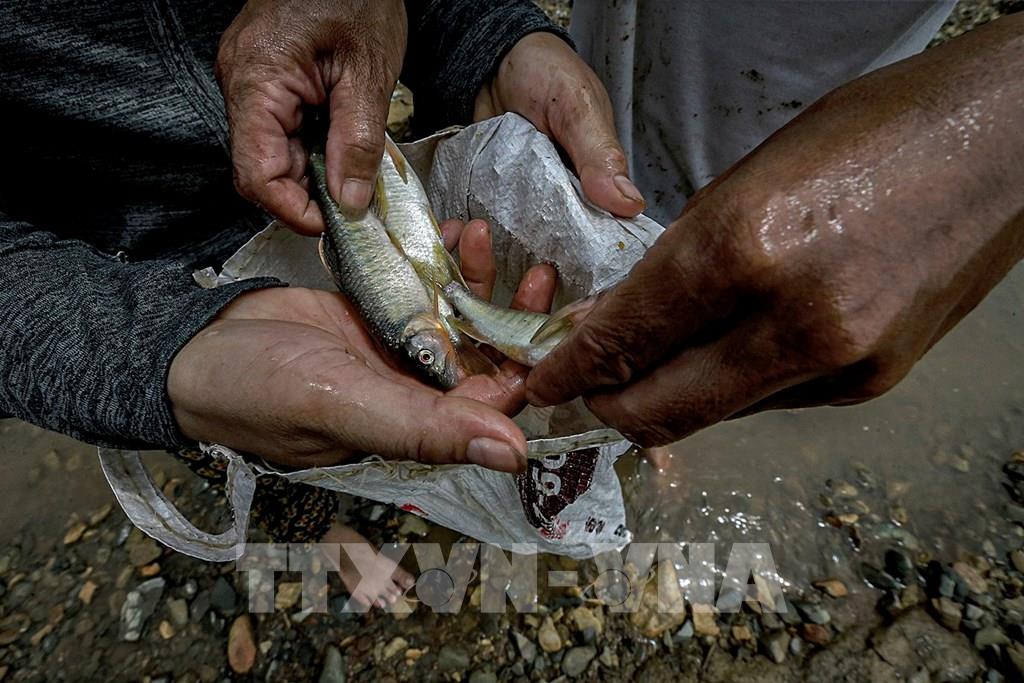 Người dân tìm bắt những con cá suối nhỏ ngay trên vùng lòng hồ cạn nước, đoạn qua xã Vầy Nưa, huyện Đà Bắc. Ảnh: Trọng Đạt - TTXVN