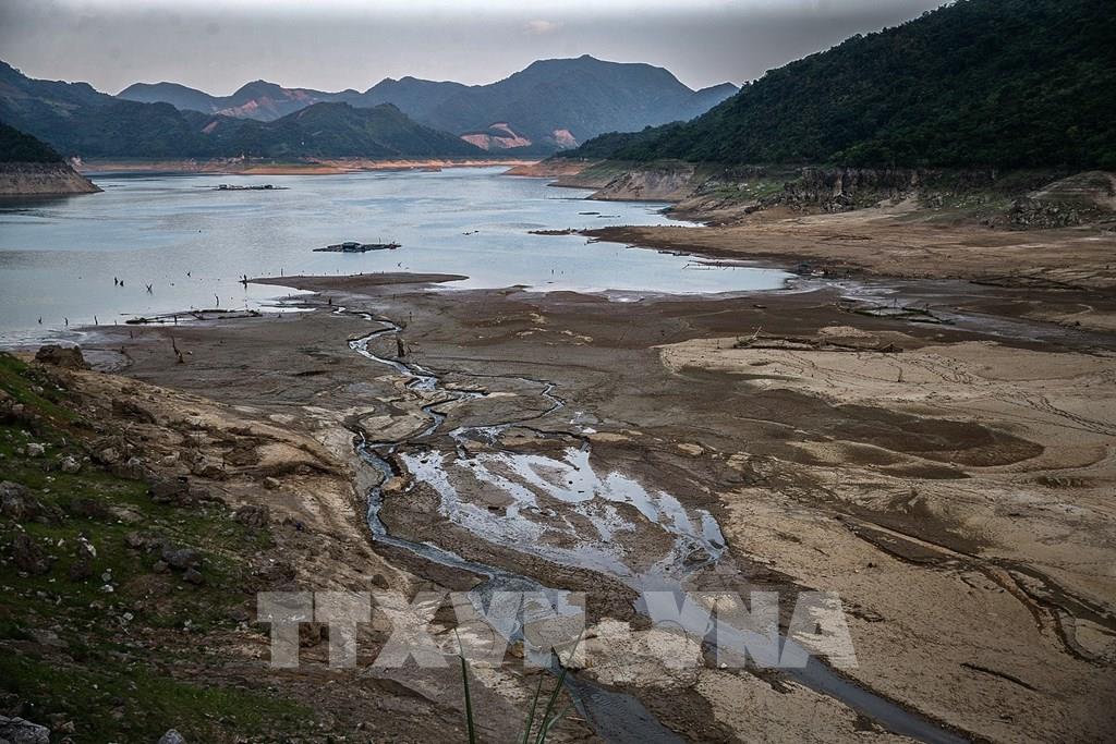 Hồ Hòa Bình sụt giảm lượng nước một cách đáng báo động - điều đang xảy ra trong nhiều năm trở lại đây do biến đổi khí hậu diễn ra ngày càng khắc nghiệt. Cuối tháng 12/2021, tuy tình hình đã có cải thiện so với tháng 11, nhưng lượng nước vẫn thiếu khoảng gần 700 triệu m3, tương đương 11% dung tích thiết kế. Ảnh: Trọng Đạt - TTXVN