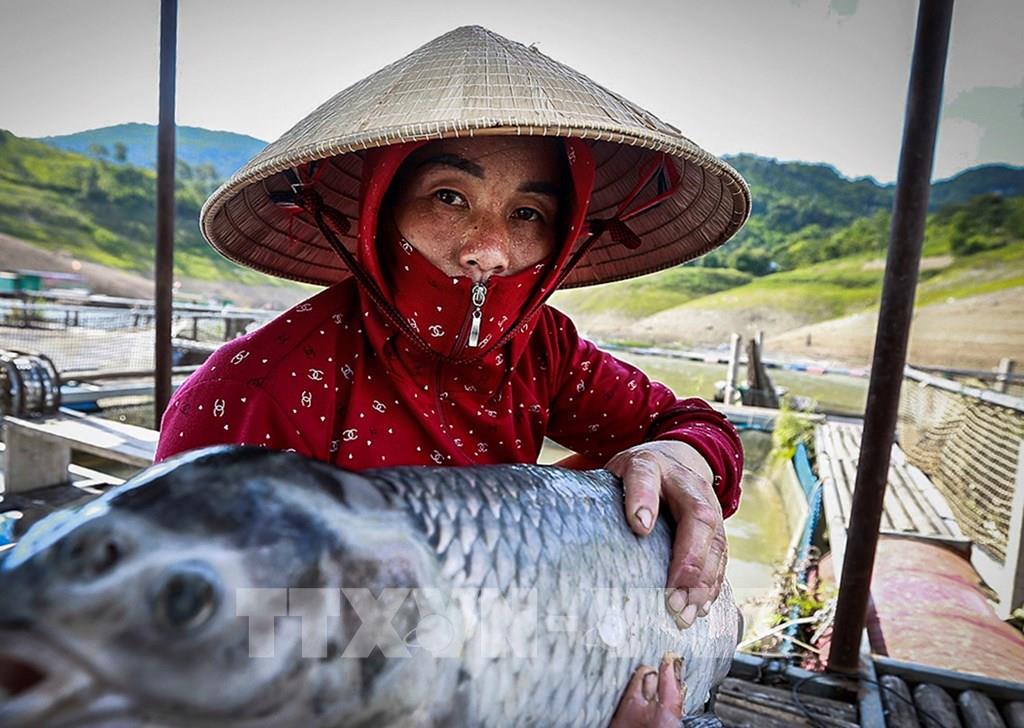 Rất nhiều cá lồng khu vực các xã Tiền Phong, Vầy Nưa, Hiền Lương của huyện Đà Bắc bị chết do sặc bùn đỏ và thiếu ô xi nghiêm trọng bởi nước hồ Hòa Bình cạn. Ảnh: Trọng Đạt - TTXVN