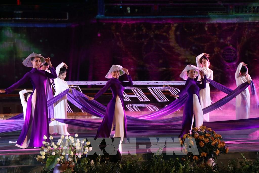 Chương trình kết hợp trình diễn thời trang áo dài, được dàn dựng công phu, kết hợp hiệu ứng âm thanh, công nghệ chiếu sáng tiên tiến và pháo hoa nghệ thuật mang đến cho người xem nhiều cảm xúc mới lạ. Ảnh: Đỗ Trưởng - TTXVN