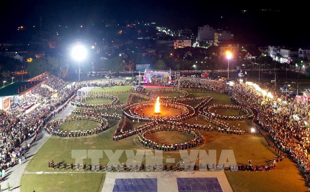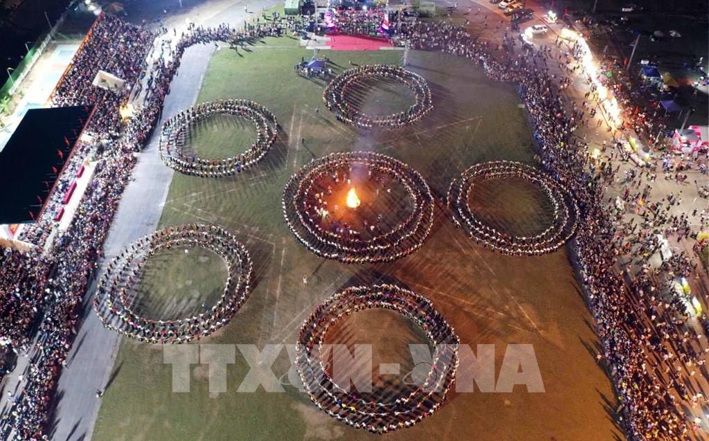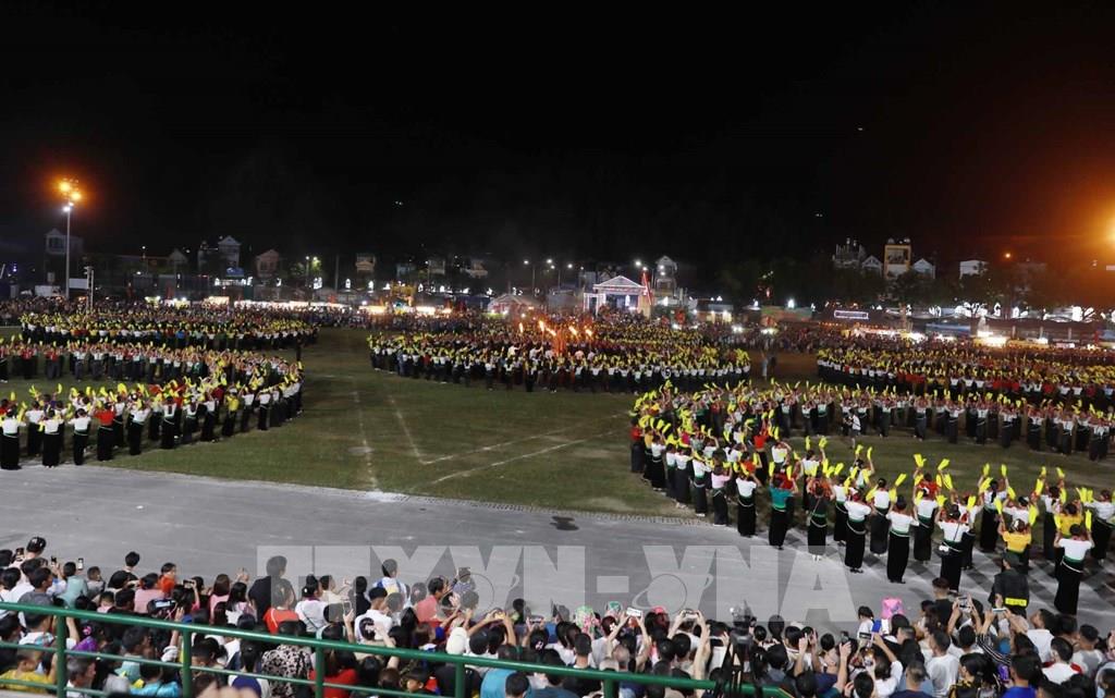 Vòng xòe Đoàn kết với sự tham gia của hơn 2000 diễn viên tại sân vận động huyện Than Uyên. Ảnh: Quý Trung - TTXVN