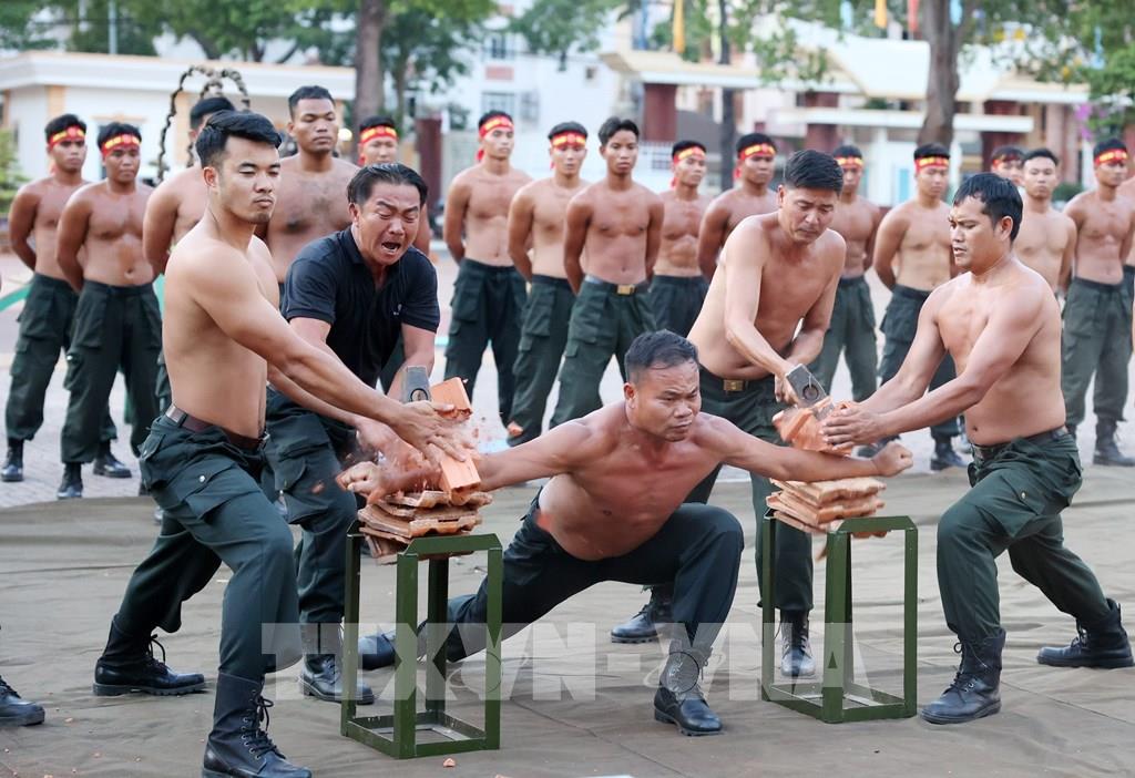 Cán bộ Phòng Cảnh sát cơ động Công an tỉnh Đắk Lắk rèn luyện võ thuật khí công. Ảnh: Hoài Thu - TTXVN