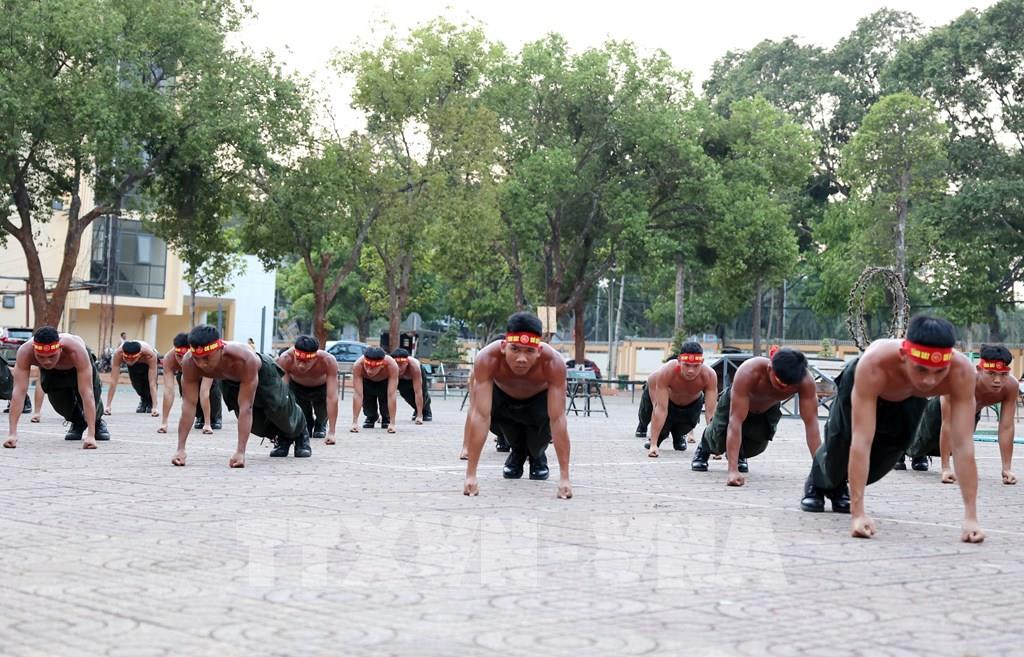 Rèn luyện các bài tập thể lực là nhiệm vụ quan trọng của cán bộ, chiến sĩ Phòng Cảnh sát cơ động Công an tỉnh Đắk Lắk. Ảnh: Hoài Thu - TTXVN