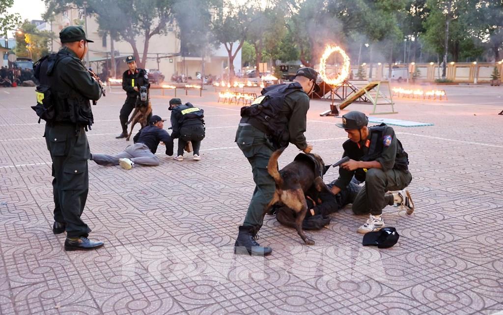 Lực lượng Cảnh sát cơ động Công an tỉnh Đắk Lắk huấn luyện chó nghiệp vụ để góp sức truy bắt các loại tội phạm. Ảnh: Hoài Thu – TTXVN