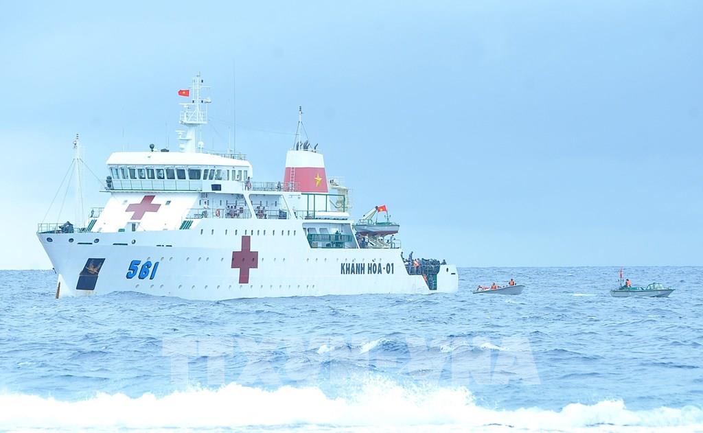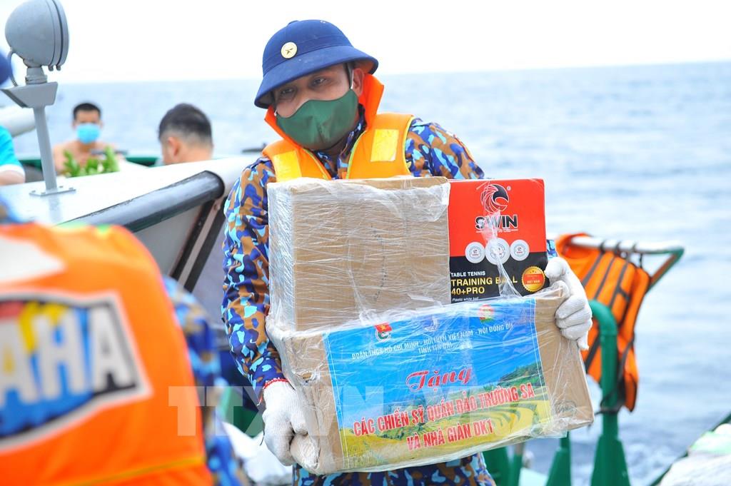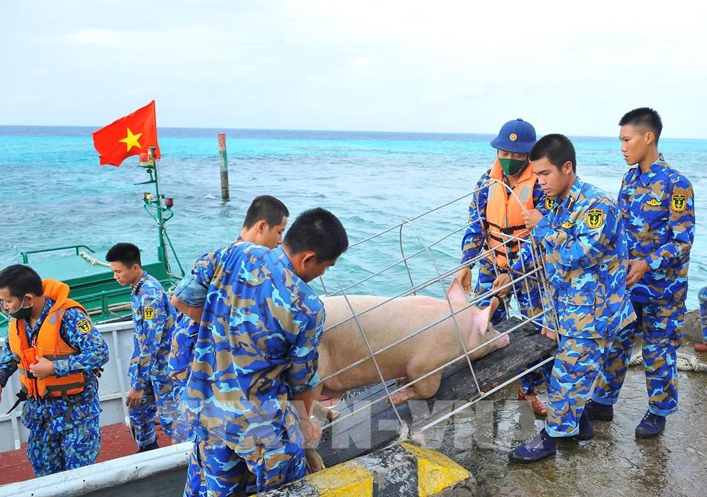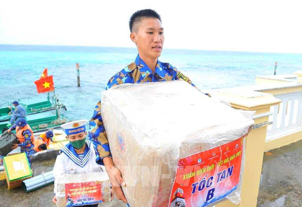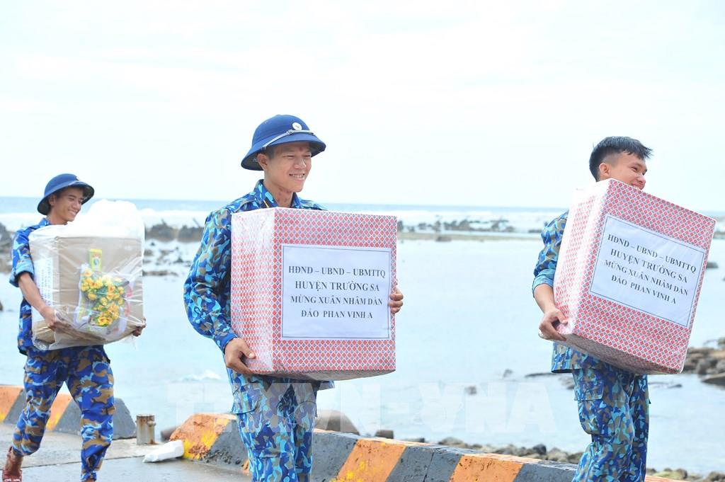 Những thùng quà của Đoàn công tác của Vùng 4 Hải quân đã vượt sóng gió, mang Tết từ đất liền đến với cán bộ, chiến sĩ đang làm nhiệm vụ trên đảo Phan Vinh. Ảnh: Minh Đức - TTXVN