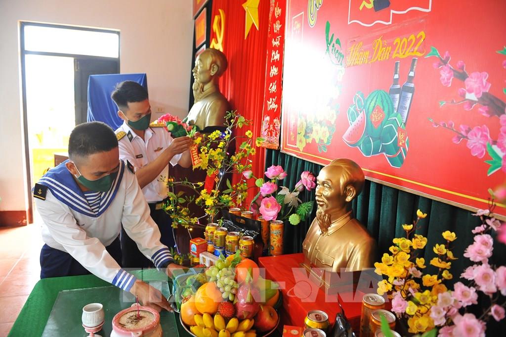 Từ những món quà Tết mang từ đất liền, các cán bộ, chiến sĩ đảo An Bang trang trí chuẩn bị mâm cỗ cổ truyền đón Xuân Nhâm Dần. Ảnh: Minh Đức - TTXVN