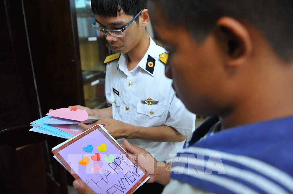 Các chiến sĩ đọc những lá thư chúc Tết do các cháu thiếu nhi trong đất liền gửi ra với những lời chúc làm ấm lòng người lính biển. Ảnh: Minh Đức - TTXVN
