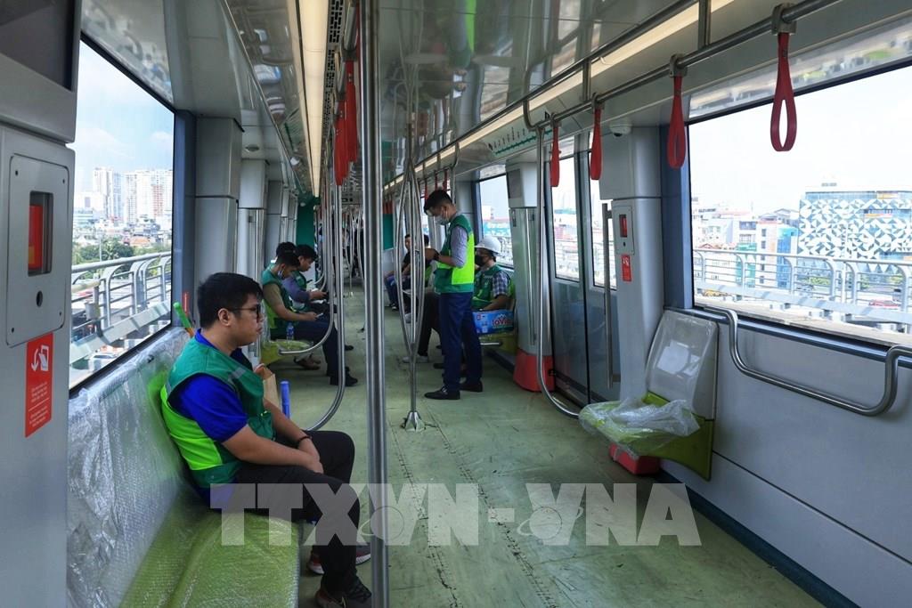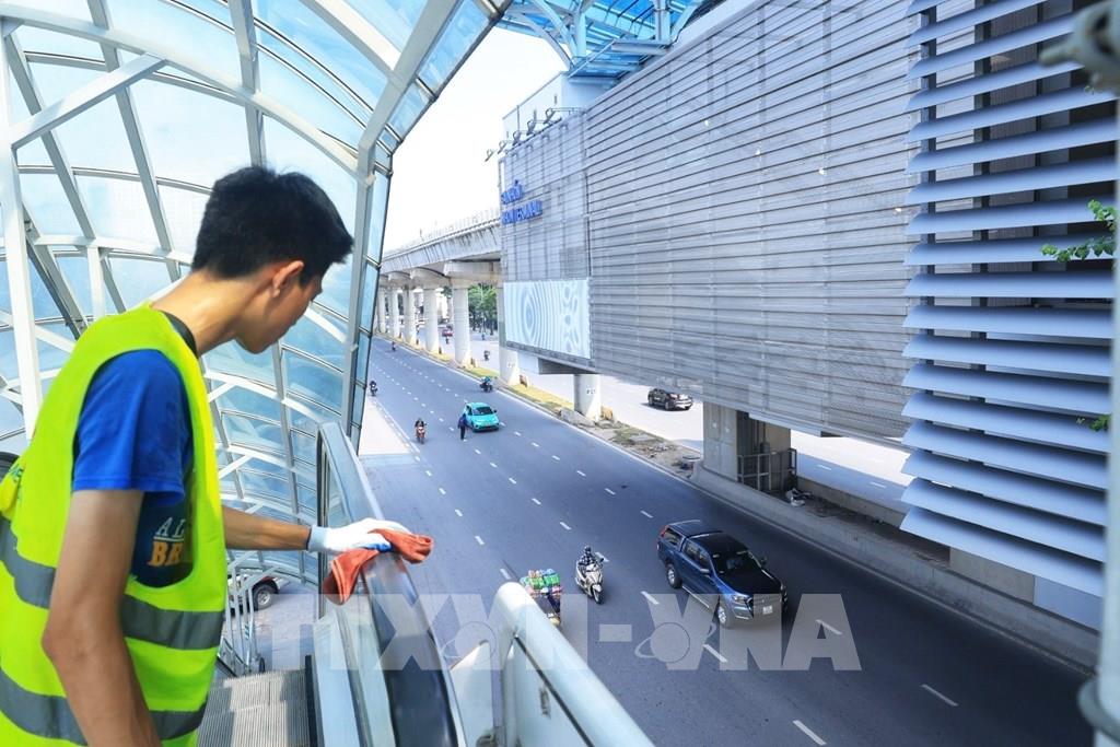 Công nhân lau dọn vệ sinh lối cầu thang bộ trước khi chạy vận hành thương mại. Ảnh: Tuấn Anh - TTXVN