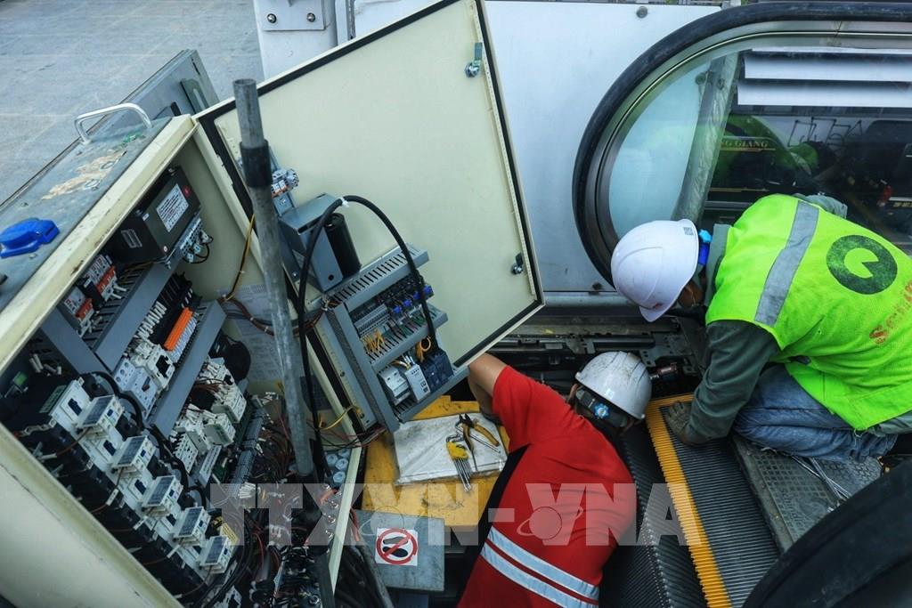 Nhân viên kỹ thuật kiểm tra hệ thống thang máy tự động vận hành lối đi bộ lên, xuống ga. Ảnh: Tuấn Anh - TTXVN