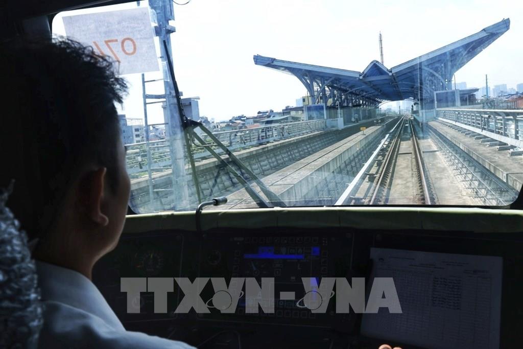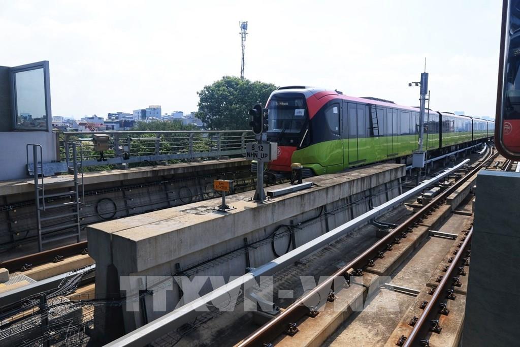 Tàu điện vận hành chạy thử tuyến từ ga S1 đến ga S8 (ga Nhổn - ga Cầu Giấy). Ảnh: Tuấn Anh - TTXVN