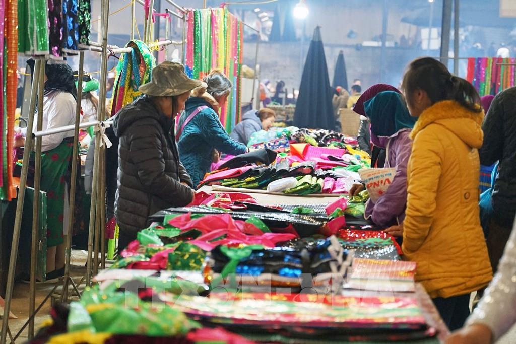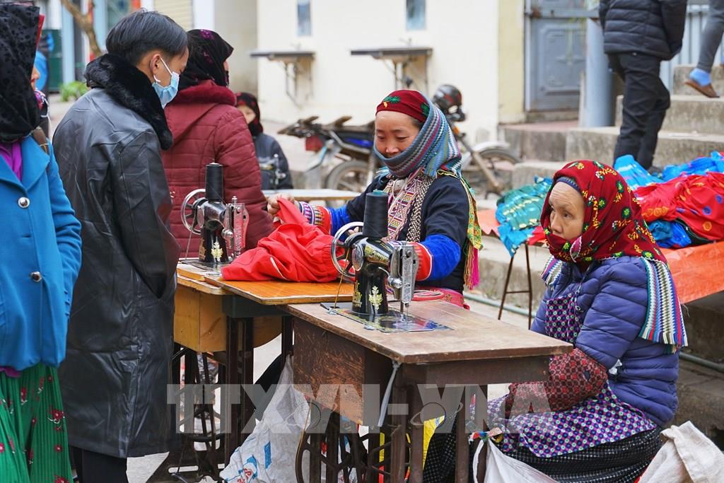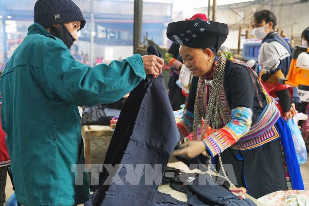 Đồng bào Dao mua, bán trang phục tại chợ phiên Mèo Vạc. Ảnh: Khánh Hòa - TTXVN