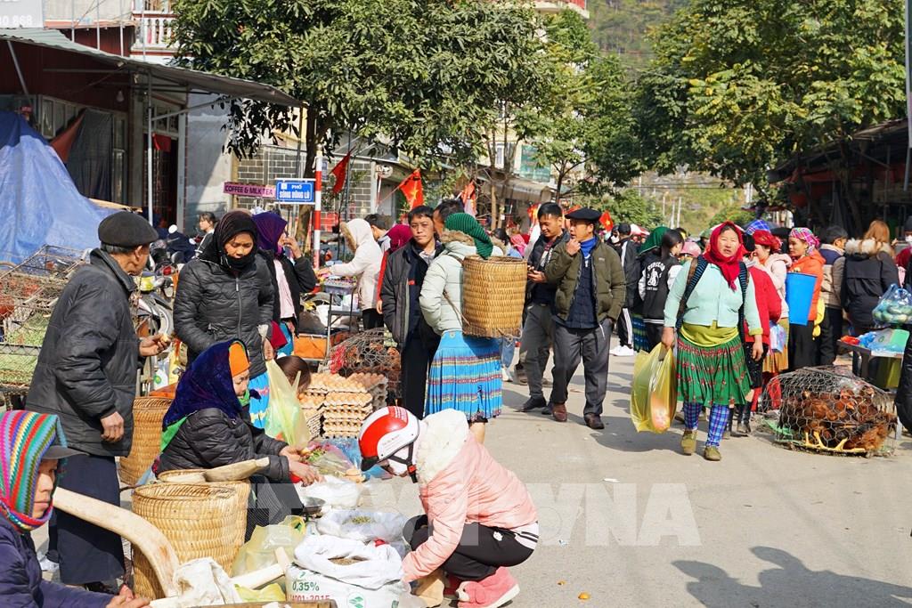 Chợ phiên Mèo Vạc thu hút rất đông người đến mua bán, cũng như các du khách muốn tìm hiểu văn hóa của địa phương. Ảnh: Khánh Hòa - TTXVN