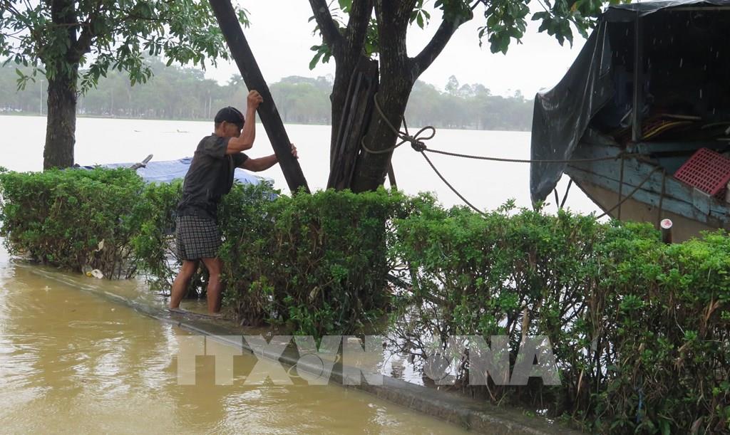 Người dân thành phố Huế gia cố thuyền để tránh bị lũ cuốn trôi, khi lũ trên sông Hương dâng cao sáng 17/11. Ảnh: Nguyên Lý-TTXVN