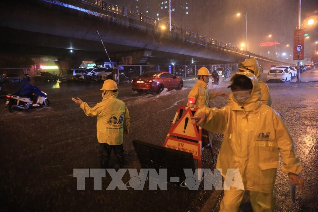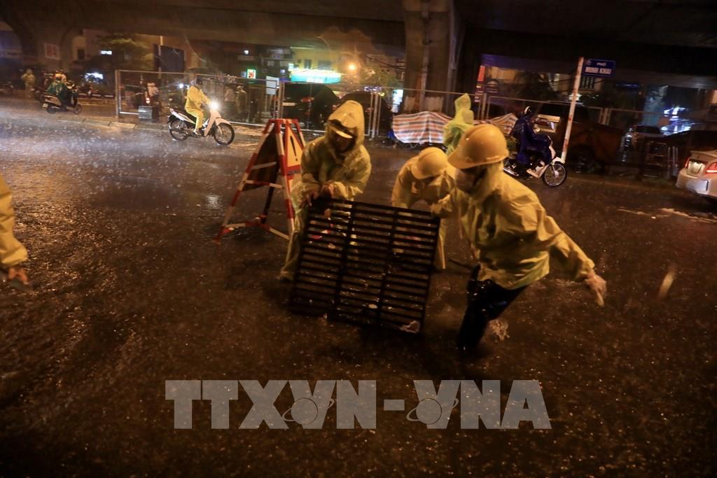 Lực lượng thoát nước làm nhiệm vụ tại phố Minh Khai, Hà Nội. Ảnh: Lâm Khánh - TTXVN