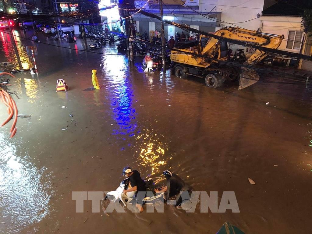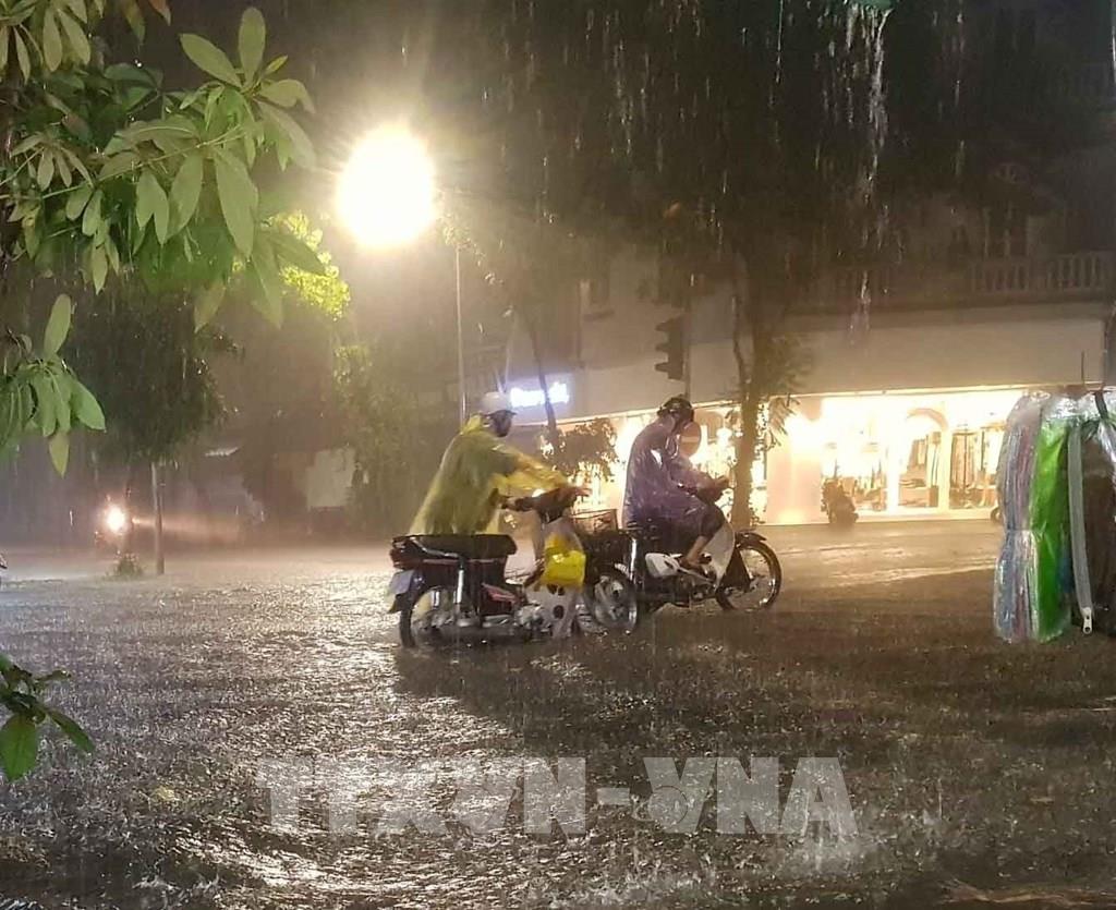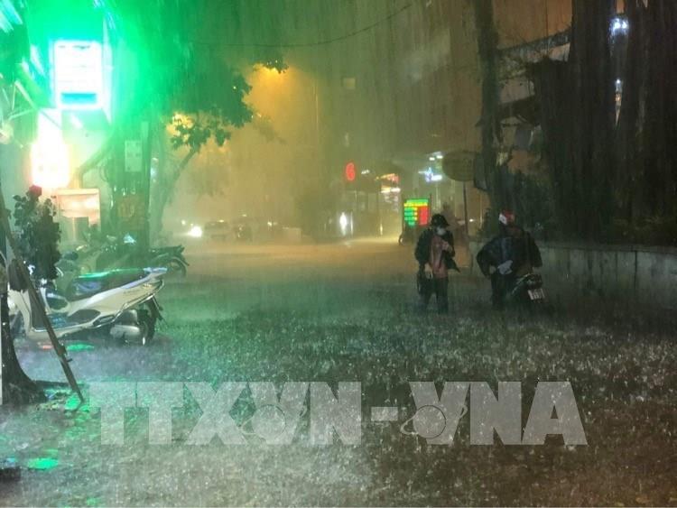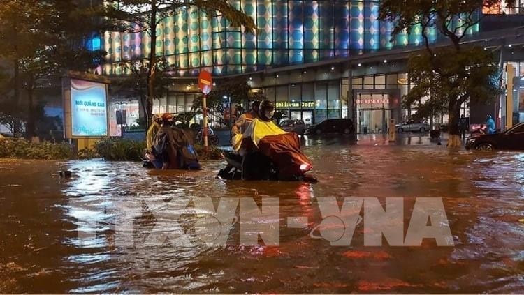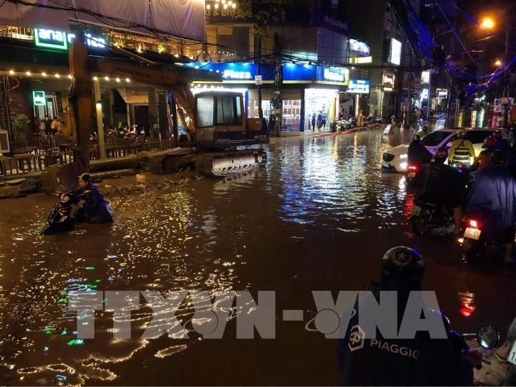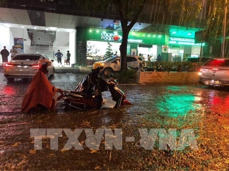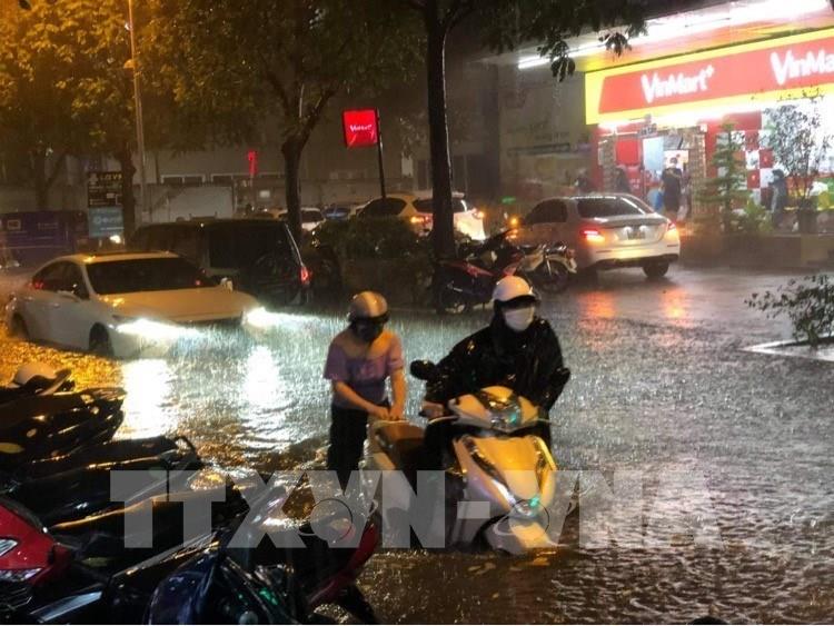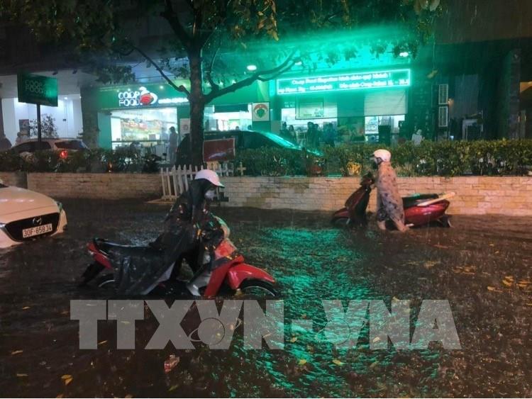 Mưa lớn gây ngập ứng cục bộ trên tuyến đường Vũ Trọng Phụng. Ảnh: Huy Hùng - TTXVN