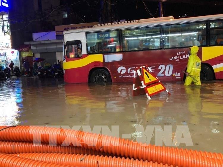 Điểm úng ngập trên phố Lê Văn Hưu. Ảnh: TTXVN
