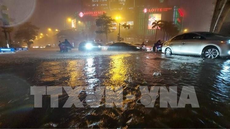 Mưa lớn gây ngập ứng cục bộ trên đường Vũ Trọng Phụng - Nguyễn Huy Tưởng. Ảnh: Huy Hùng - TTXVN