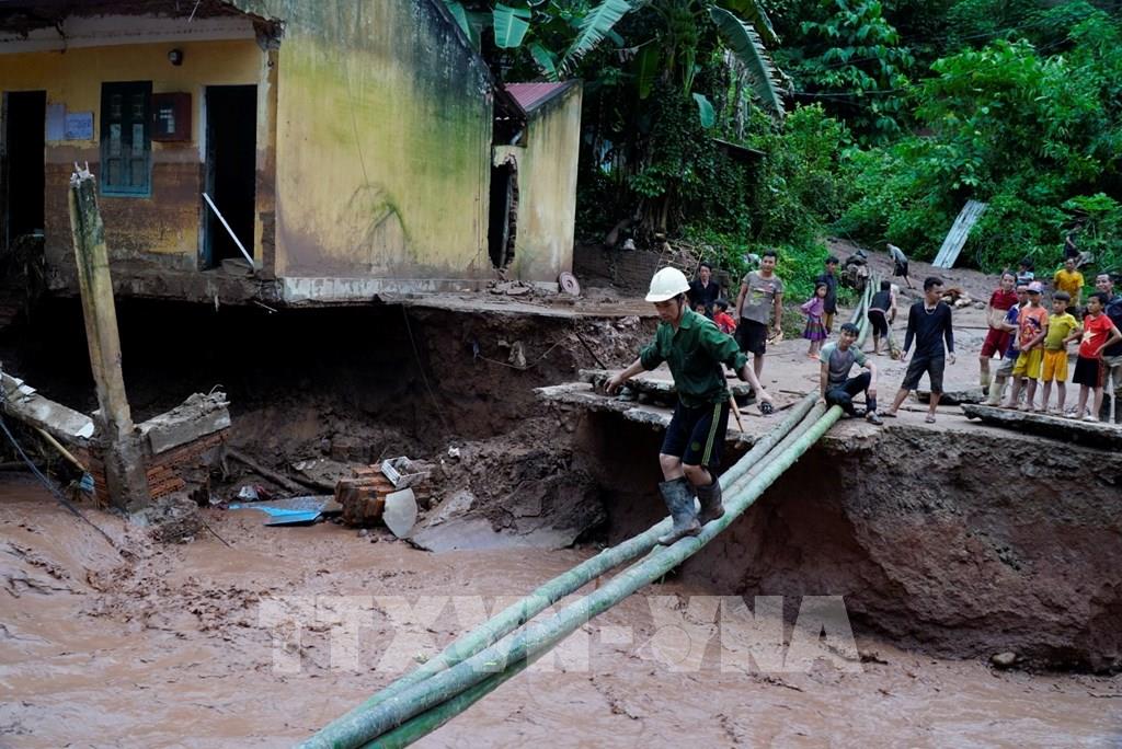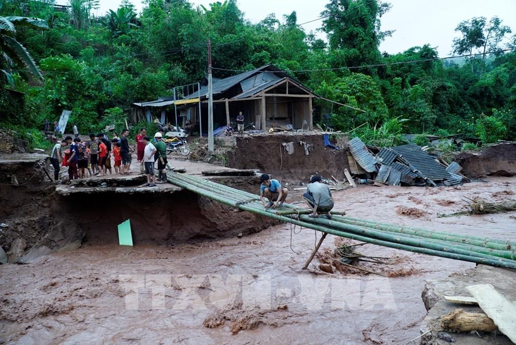 Người dân làm cầu tạm để đi sau khi bị nước lũ cuốn trôi mất đường. Ảnh: Xuân Tư - TTXVN