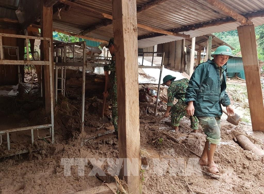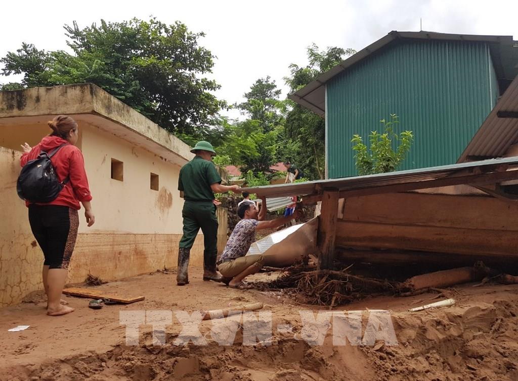 Người dân, chính quyền địa phương, bộ đội Đồn biên phòng Nậm Nhừ đang khẩn trương khắc phục hậu quả nhằm giúp người dân bị thiệt hại sớm ổn định cuộc sống. Ảnh: Xuân Tiến - TTXVN