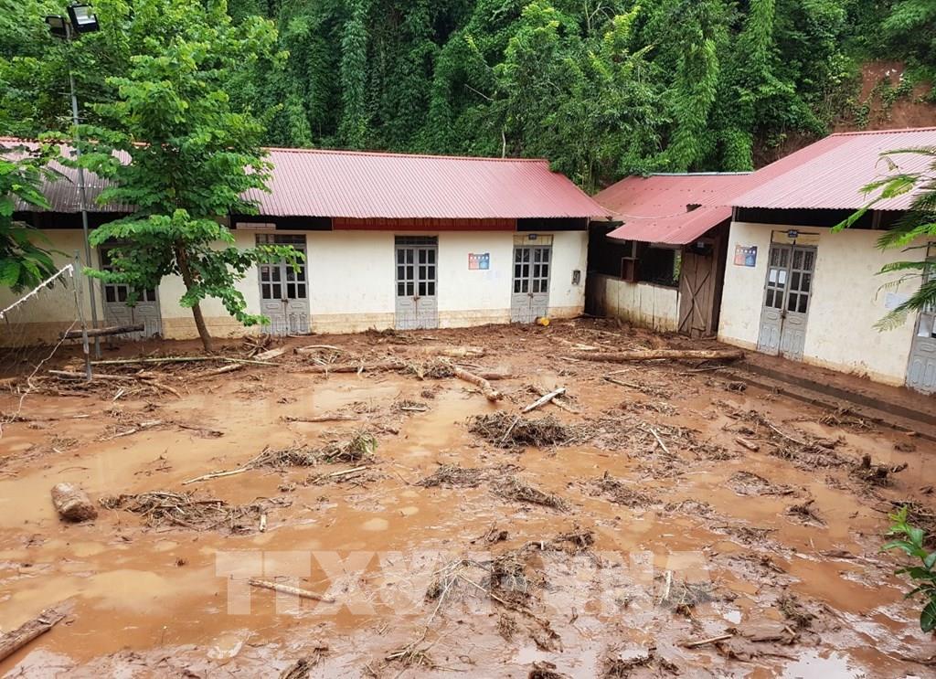 Dãy nhà bán trú của học sinh Trường Tiểu học Nậm Nhừ bị thiệt hại nặng nề do lũ quét gây ra. Ảnh: Xuân Tiến - TTXVN