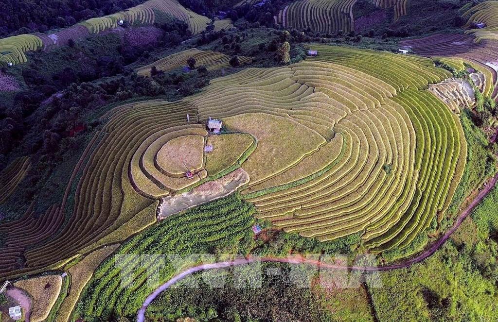 Những thửa ruộng bậc thang mùa lúa chín tại xã Xím Vàng tạo khung cảnh thơ mộng thu hút rất đông khách du lịch. Ảnh: Quang Quyết - TTXVN