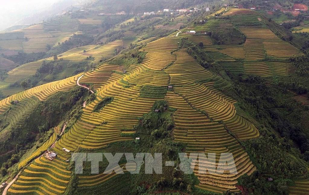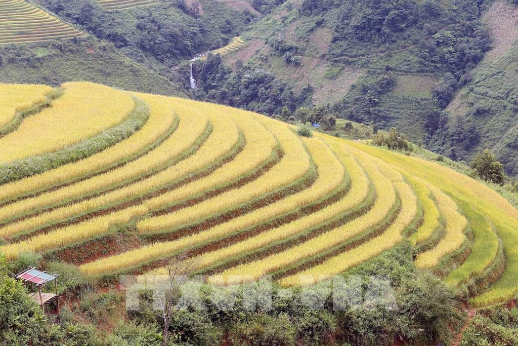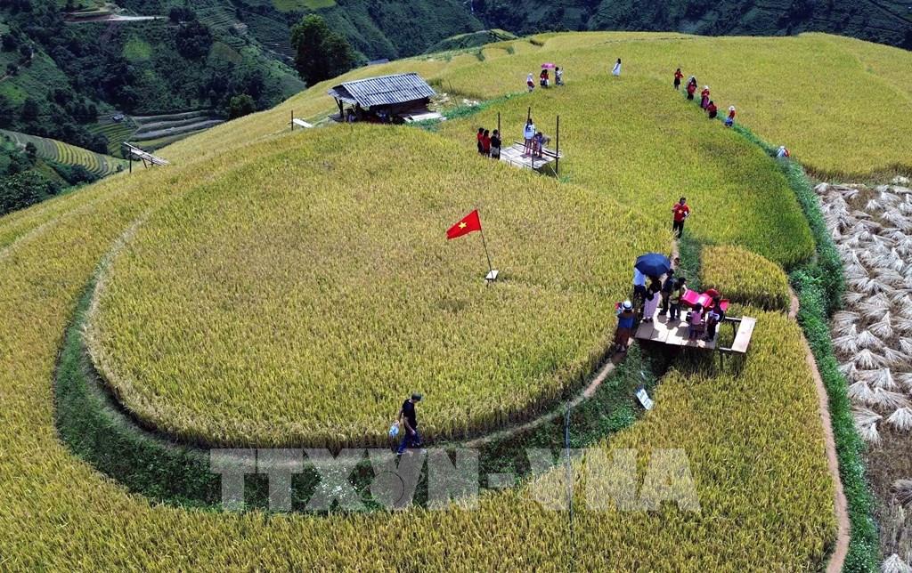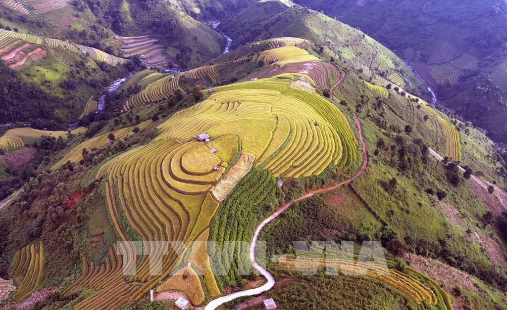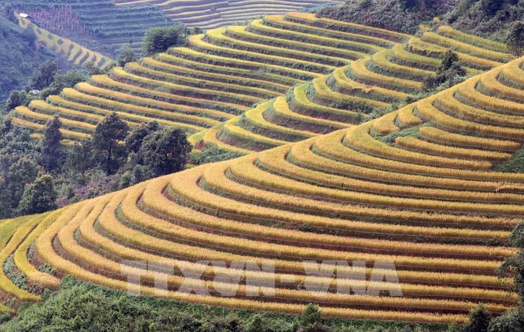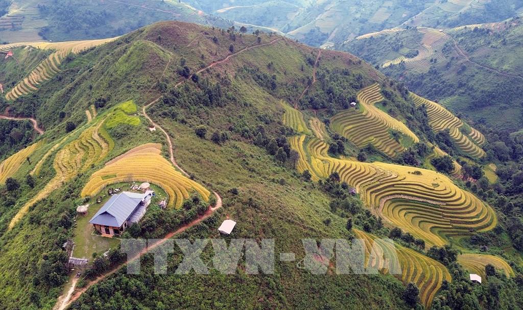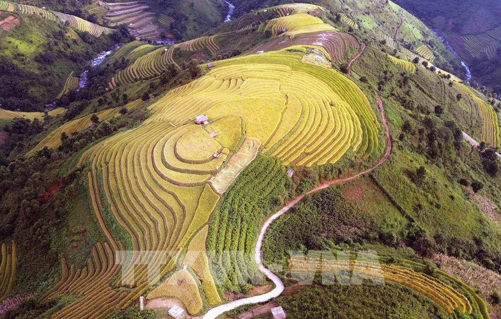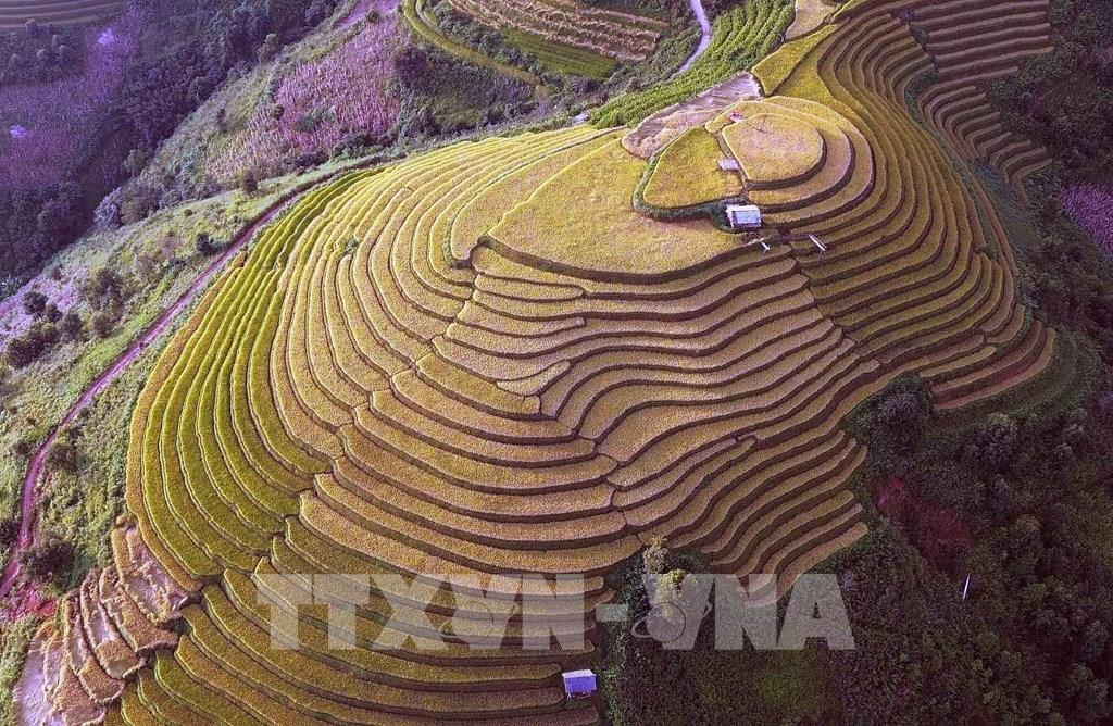 Những thửa ruộng bậc thang mùa lúa chín tại xã Xím Vàng tạo khung cảnh thơ mộng thu hút rất đông khách du lịch. Ảnh: Quang Quyết - TTXVN