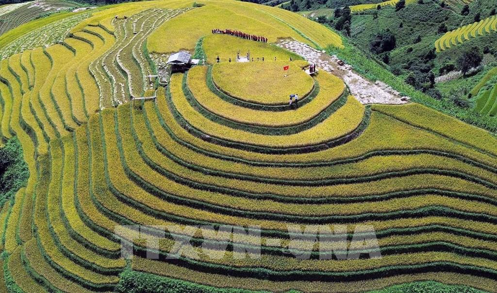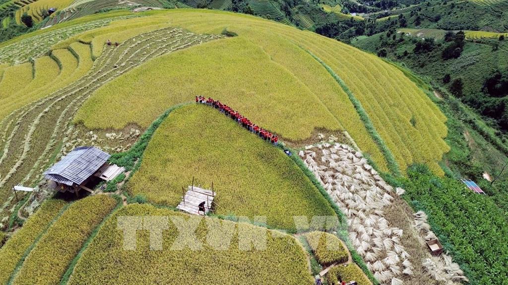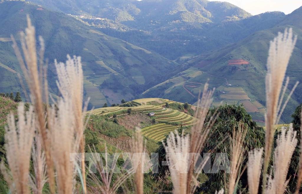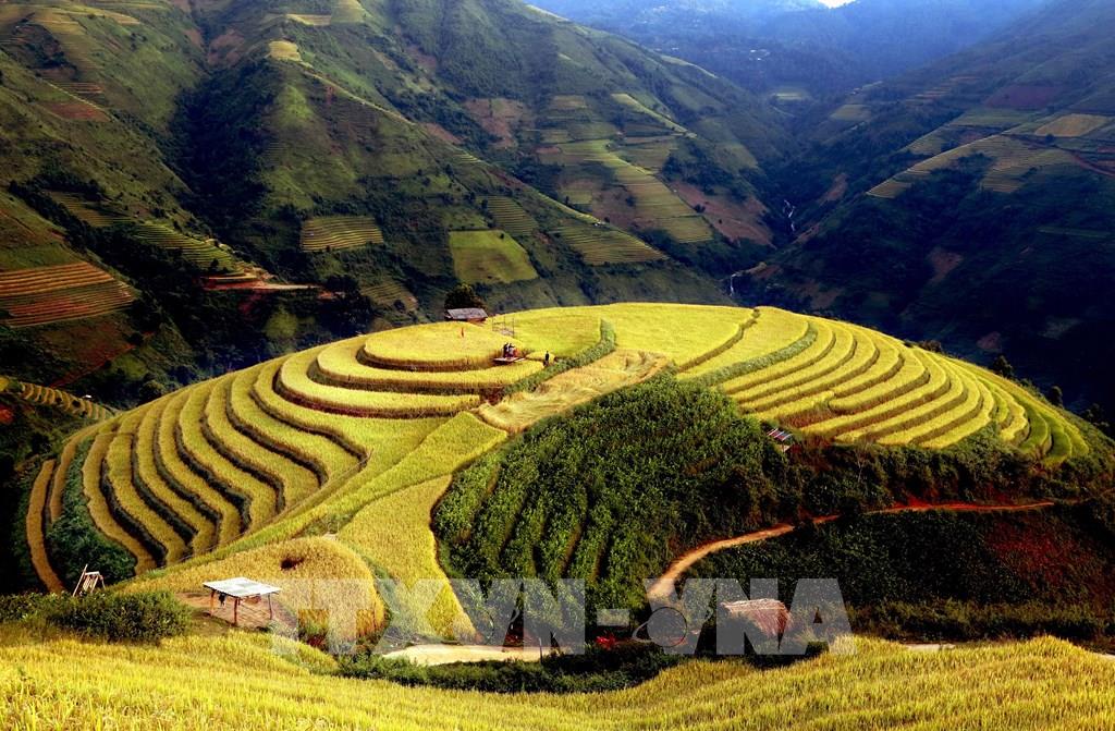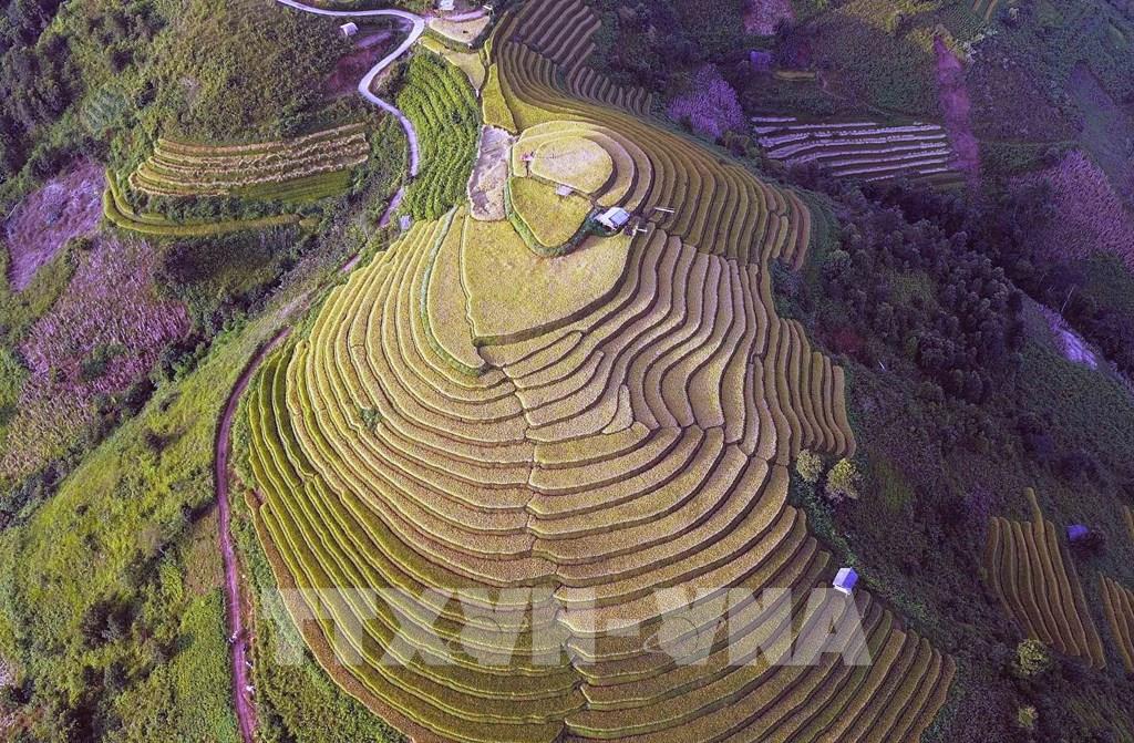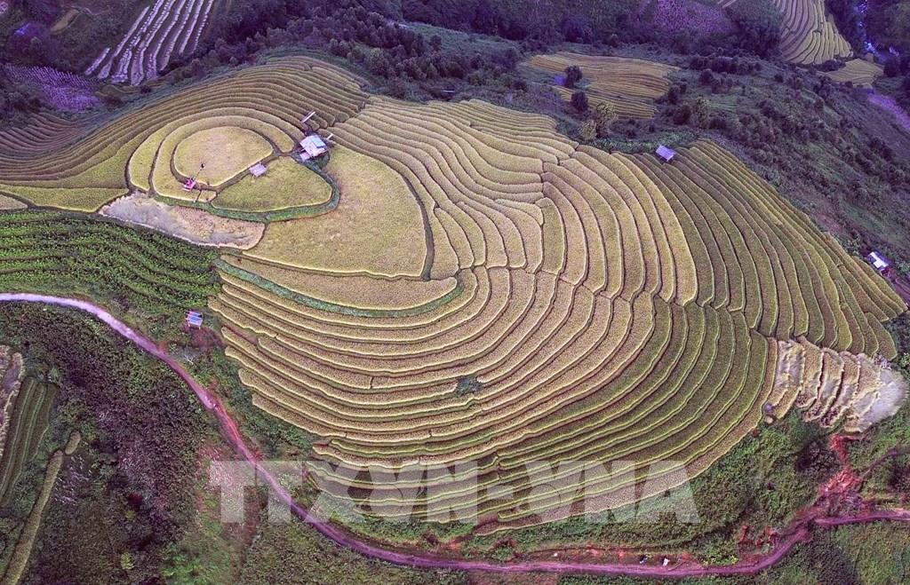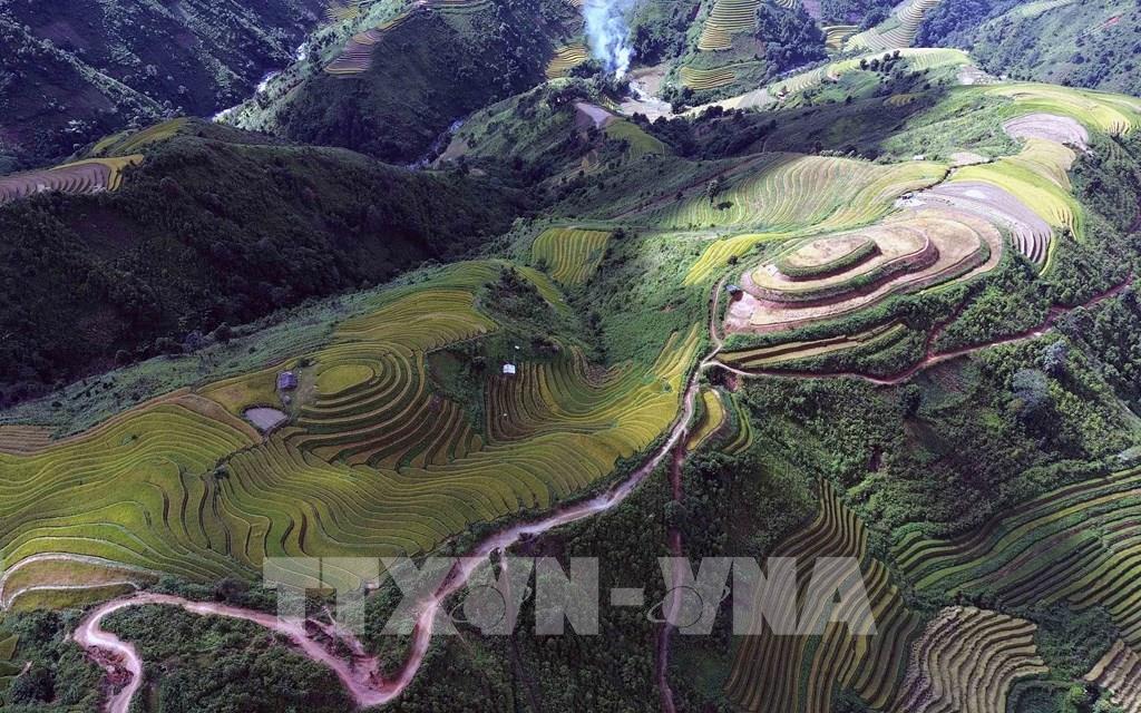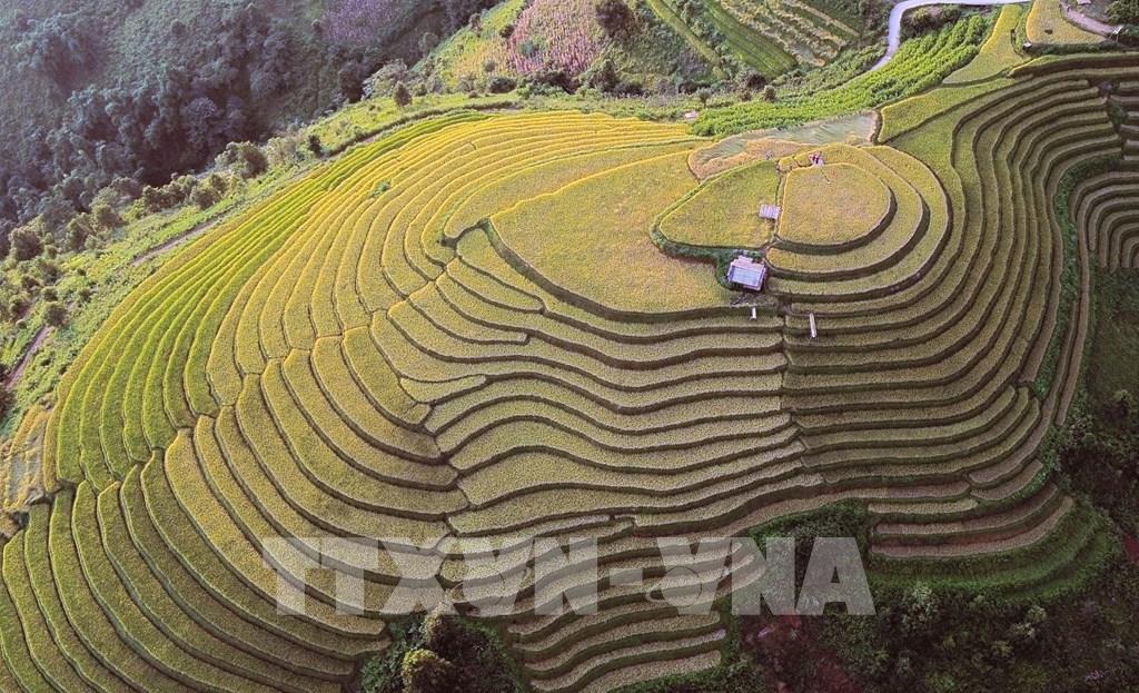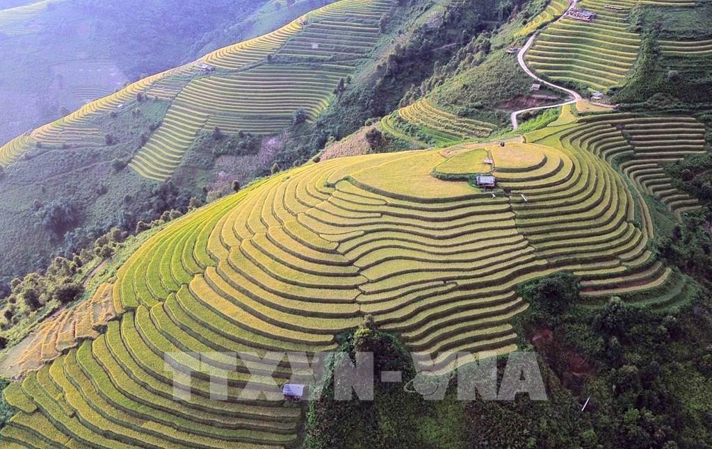 Những thửa ruộng bậc thang mùa lúa chín tại xã Xím Vàng tạo khung cảnh thơ mộng thu hút rất đông khách du lịch. Ảnh: Quang Quyết - TTXVN