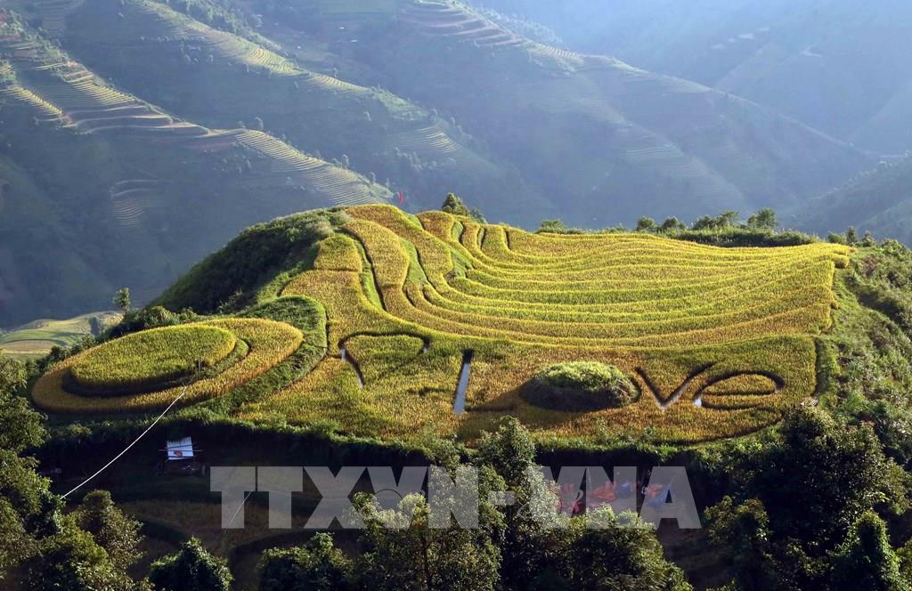 Nhiều hộ đồng bào dân tộc Mông đã thiết kế, tạo đường nét trên các ruộng lúa để thu hút khách du lịch đến với xã Xím Vàng, huyện Bắc Yên. Ảnh: Quang Quyết - TTXVN