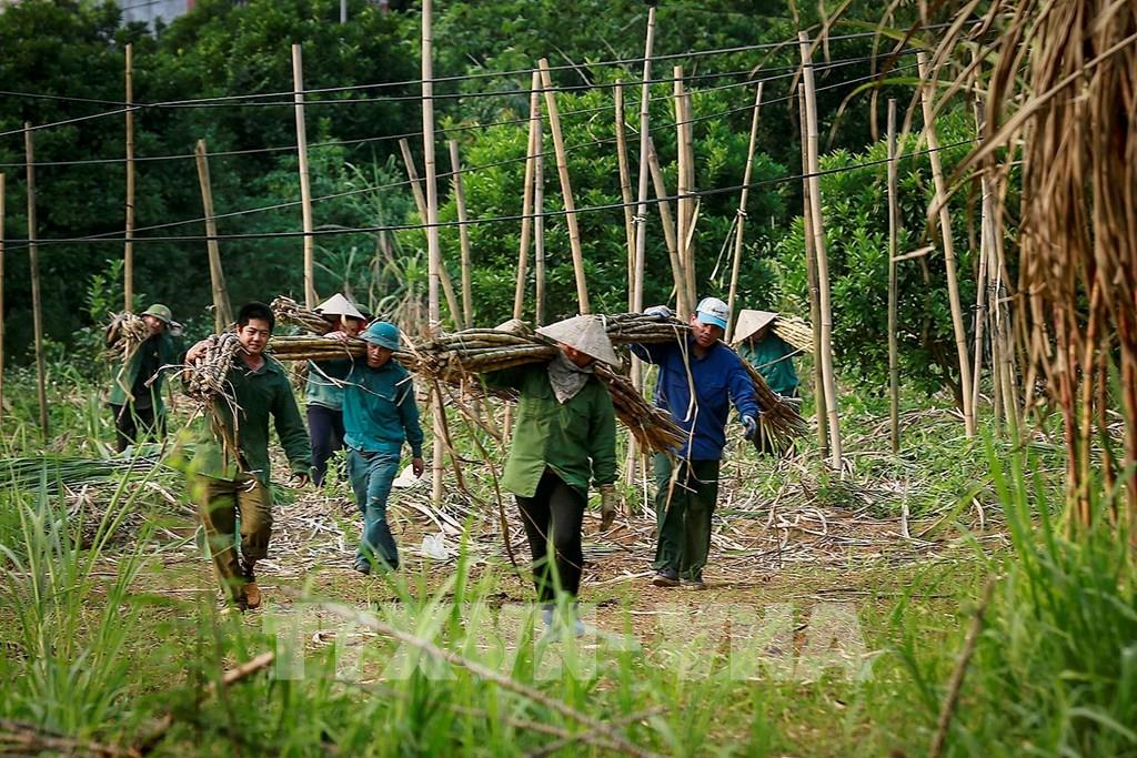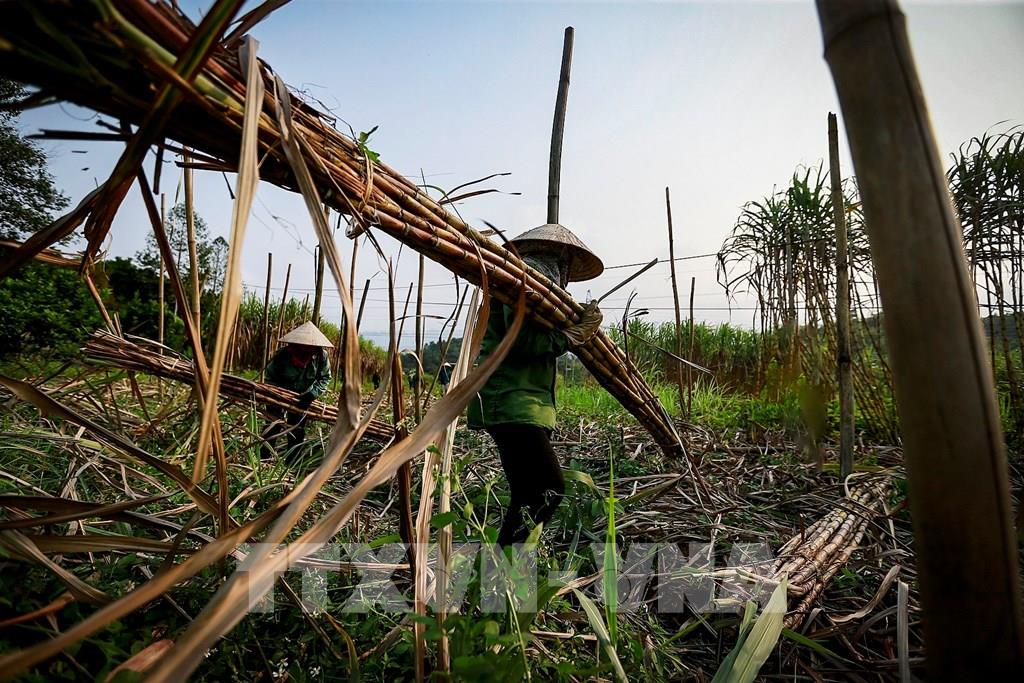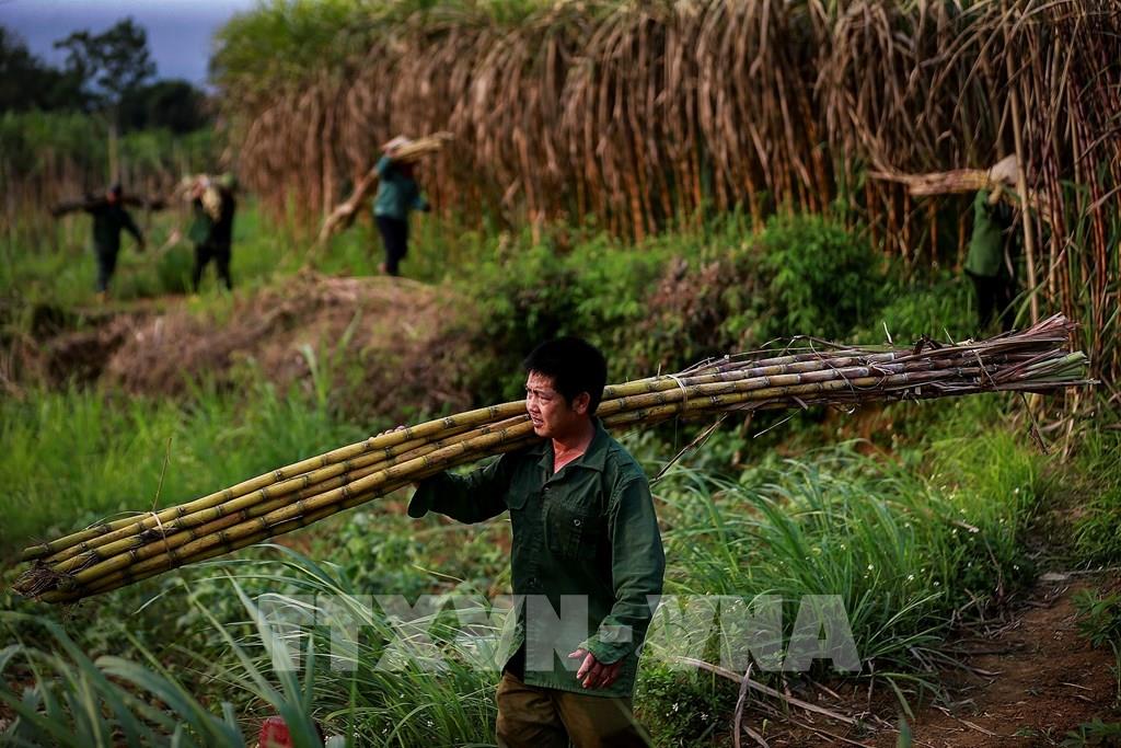 Trong ảnh: Những người công nhân vác mía thuê tại một ruộng mía xã Tử Nê, họ sẽ vận chuyển một quãng đường khoang 300m với bó mía 30kg trên vai. Ảnh: Trọng Đạt – TTXVN