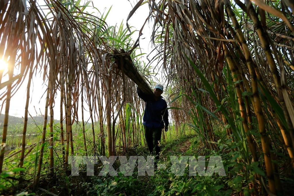 Anh Bùi Văn Minh (thị trấn Mãn Đức) là người được thuê thu hoạch mía trên ruộng mía thuộc xóm Nen, xã Tử Nê. Việc của anh là hạ những cây mía xuống và bó lại từng bó, khoảng 16 cây/bó có khối lượng khoảng 30kg/bó. Ảnh: Trọng Đạt – TTXVN