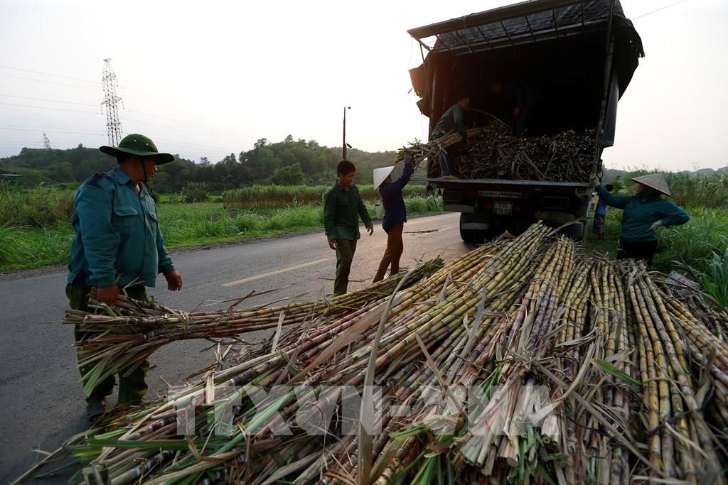 Những bó mía được người dân chuyển ra xe ô tô thu mua ngay phía trên đường. Ảnh: Trọng Đạt – TTXVN