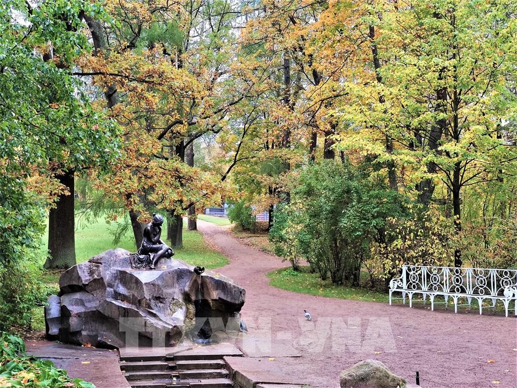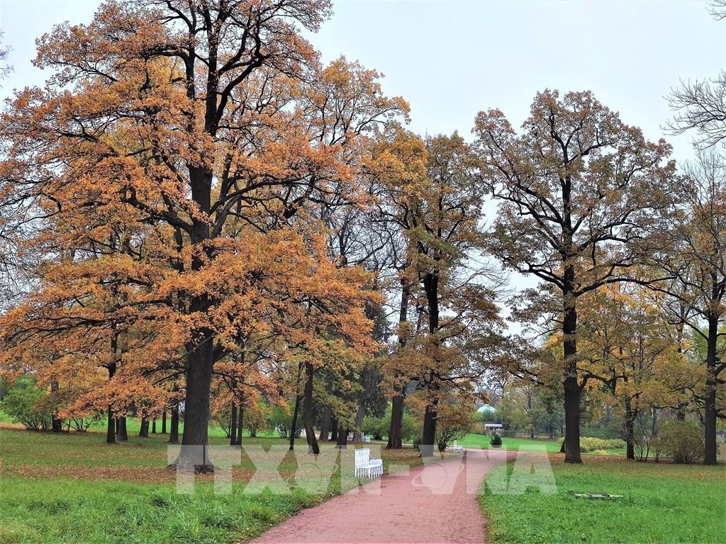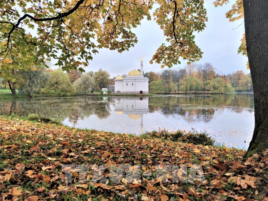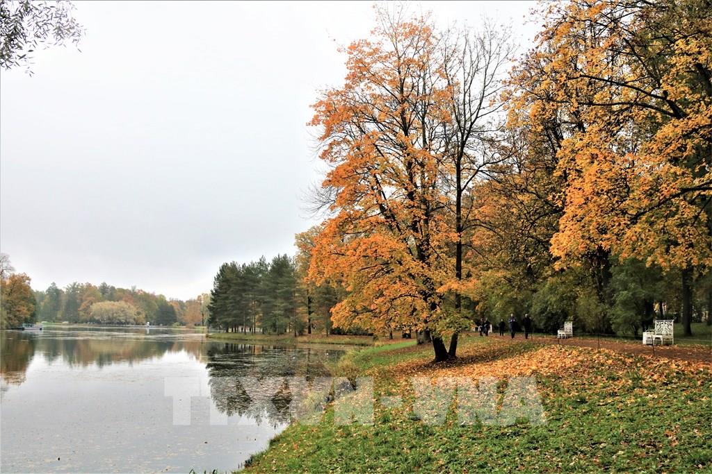 Mùa thu thấm đẫm từng góc nhỏ trong công viên Ekaterina. Ảnh: Duy Trinh - P/v TTXVN tại Liên bang Nga ; Một trong những địa danh có phong cảnh hữu tình để dạo chơi ở thành phố St. Petersburg cổ kính của nước Nga đó là “Làng vua” (Tsarskoe Selo) thuộc thị trấn Pushkin. Từng góc nhỏ, từng cảnh quan nơi đây đều nên thơ trong tiết trời mùa Thu dù là trời nắng đẹp hay u ám, ẩm ướt. Ảnh: Duy Trinh - P/v TTXVN tại Liên bang Nga
