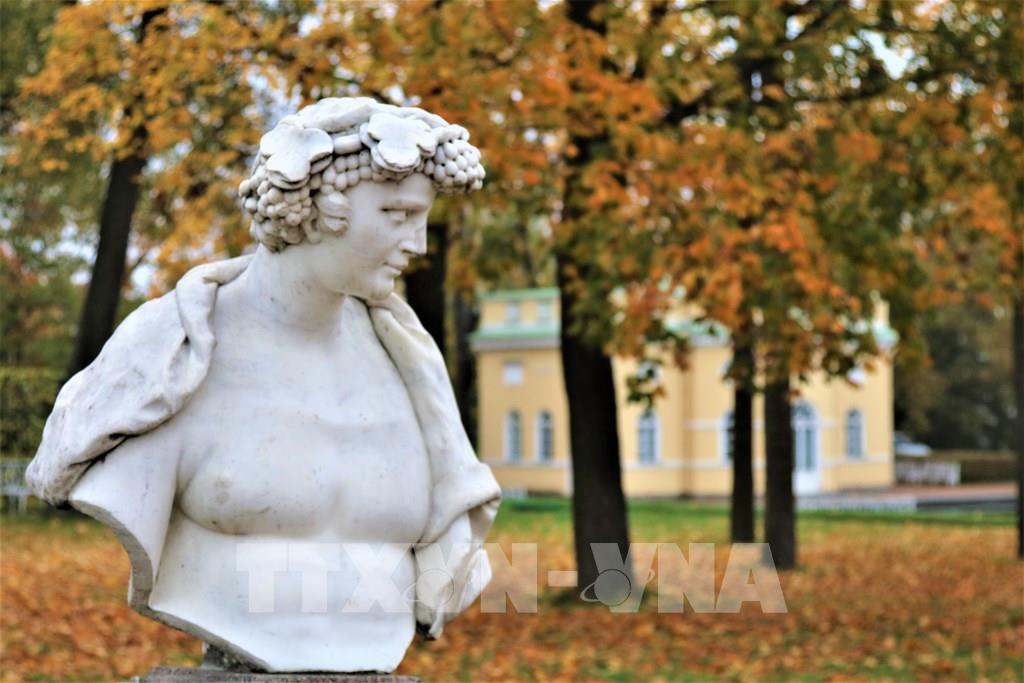 Một bức tượng trong Cung Ekaterina trong sắc thu vàng. Ảnh: Duy Trinh - P/v TTXVN tại Liên bang Nga