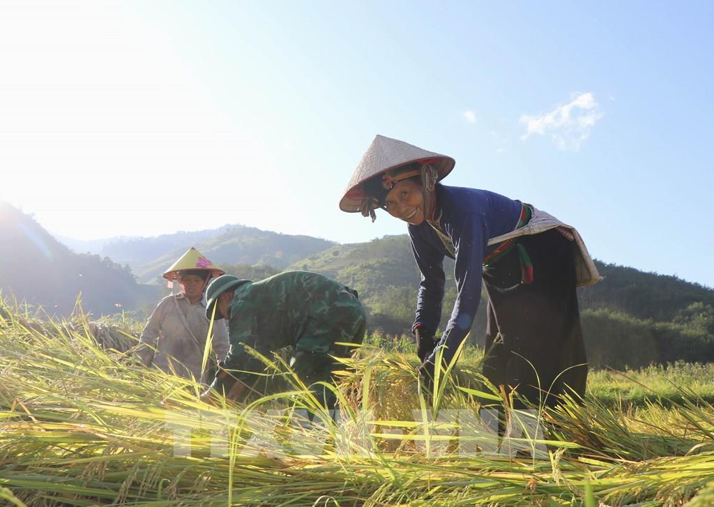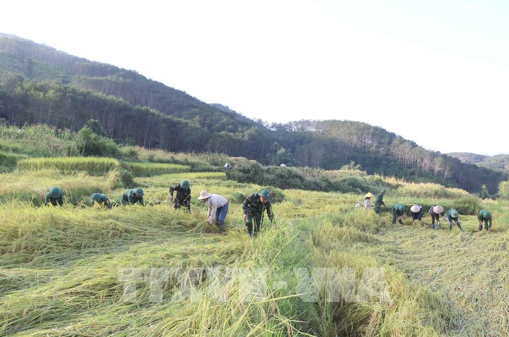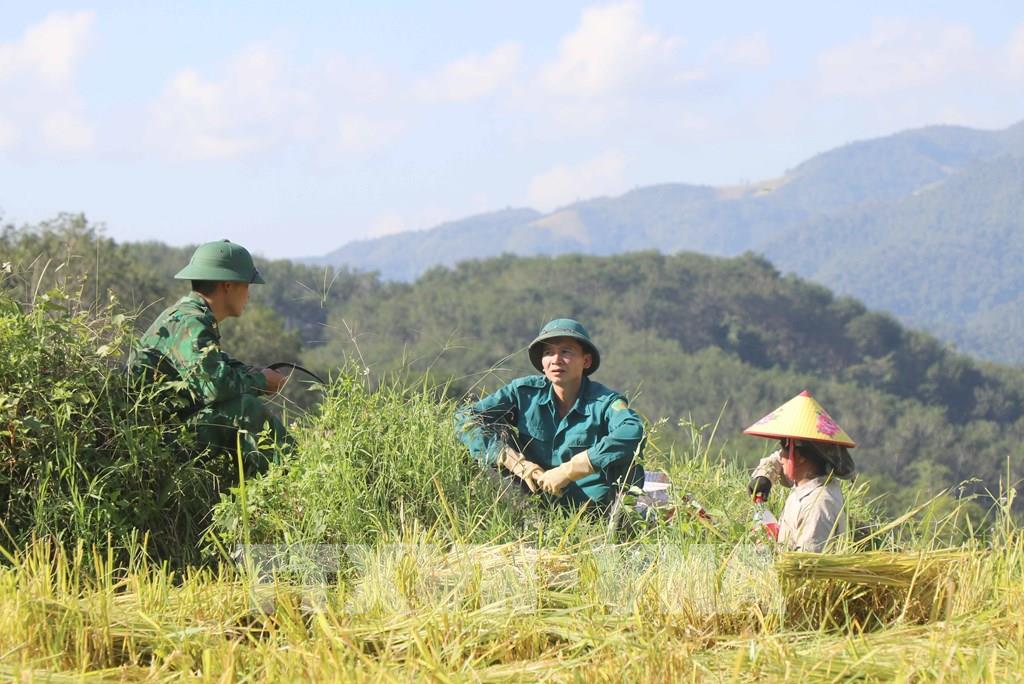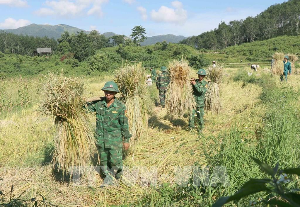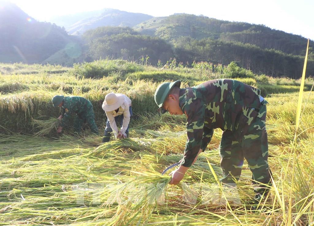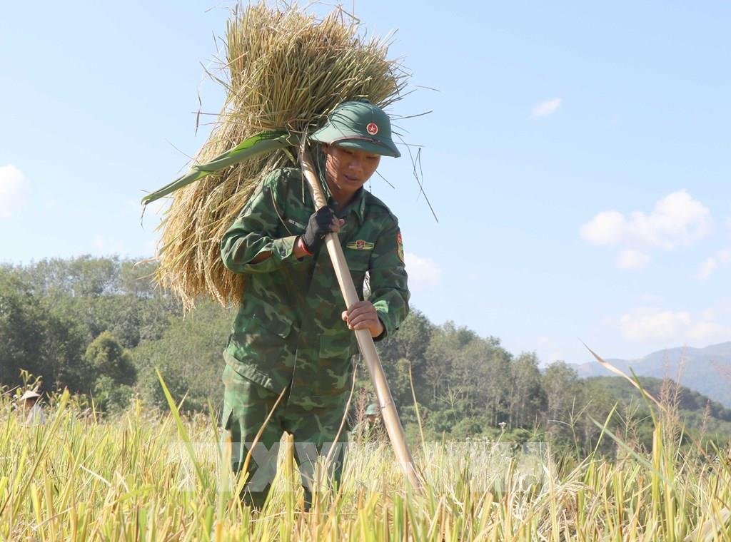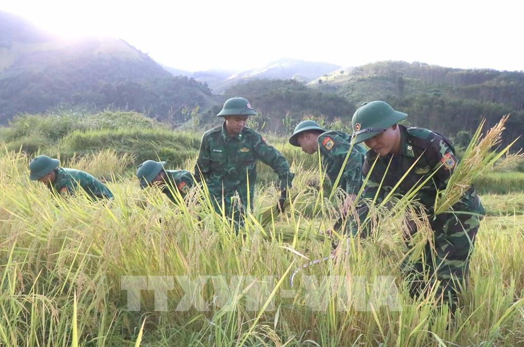 Cán bộ, chiến sĩ biên phòng Đồn Biên phòng Mường Pồn tham gia gặt 2ha lúa một vụ giúp gia đình anh Lò Văn Thời (bản Mường Pồn 2, xã Mường Pồn, huyện Điện Biên, tỉnh Điện Biên). Ảnh: Xuân Tiến - TTXVN